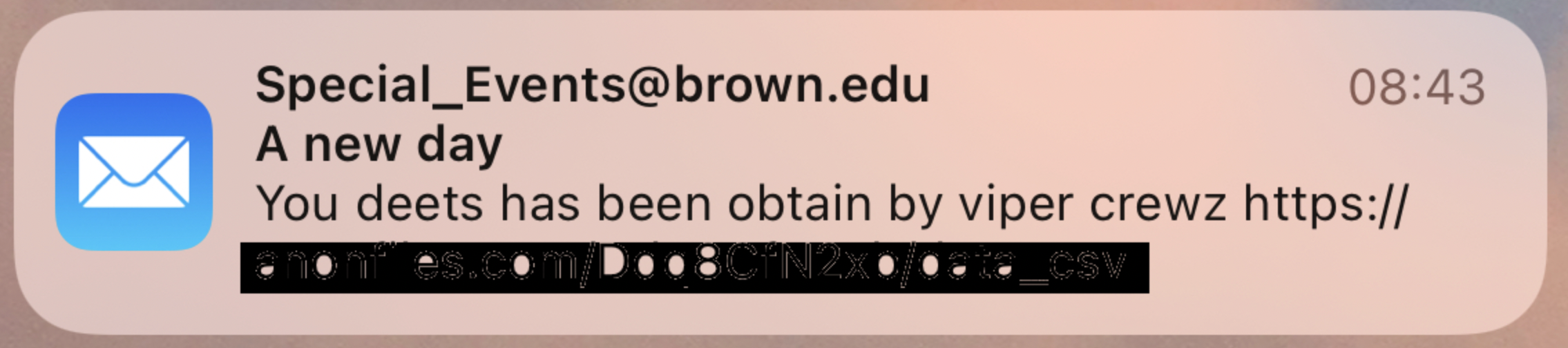 We encourage you simply to delete the original message(s) and any others you might receive with similar or questionable content. It’s relevant to note that the unauthorized sender of today’s emails created a link that would allow others to access the list of email addresses used to send today’s unauthorized emails. You may receive other spam messages from accounts pretending to be Brown senders, or from other email addresses.
