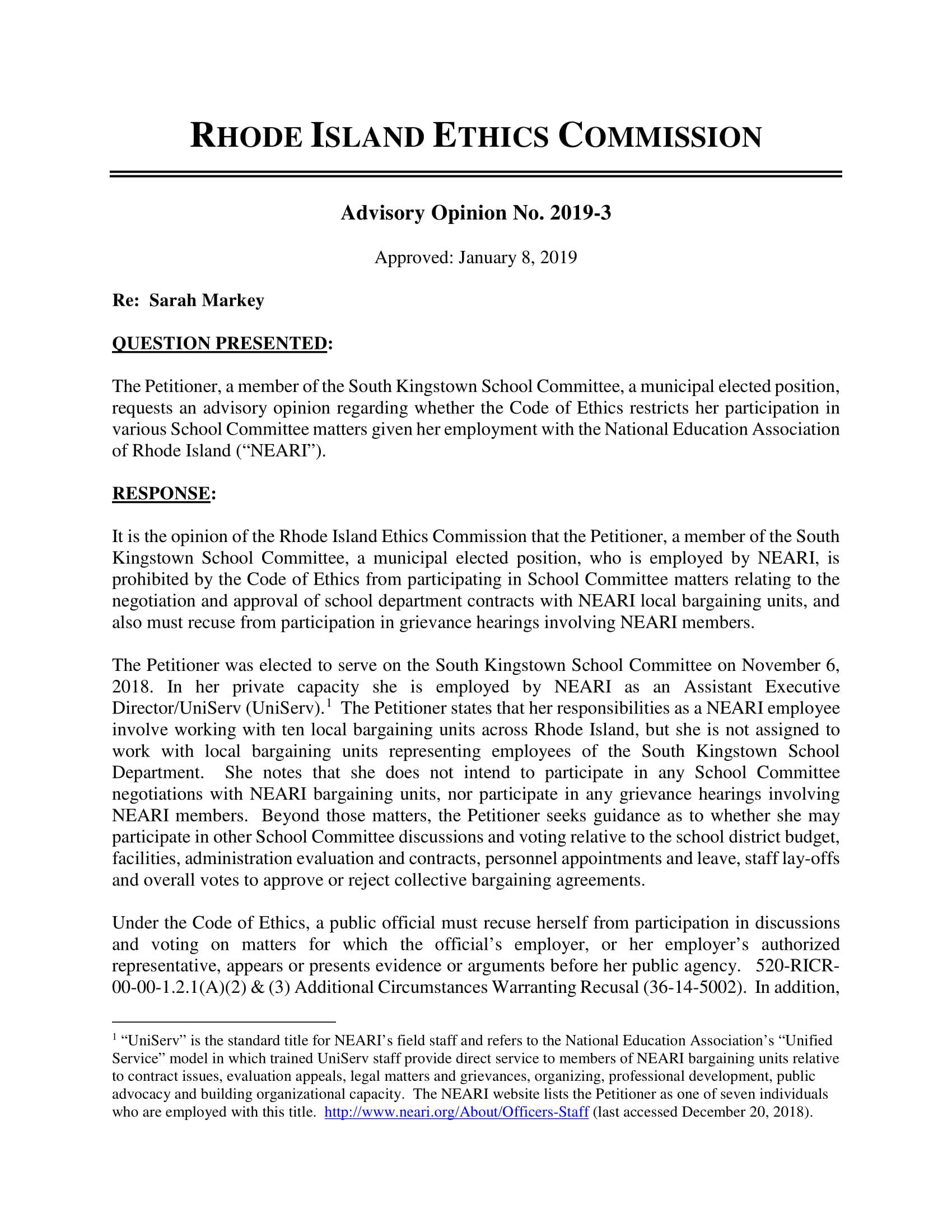 However, after two different law firms warned the town of South Kingstown that Markey, who is a $166,000 a year organizer for NEARI, which represents the majority of the faculty and staff in the South Kingstown schools, would be in near constant conflict as a member of the town’s school committee, the Ethics Commission in their four-page opinion on Tuesday said matters such as budgets, facilities, and personnel appointments would likely not constitute a direct financial interest for NEARI — and would not require Markey to recuse herself.