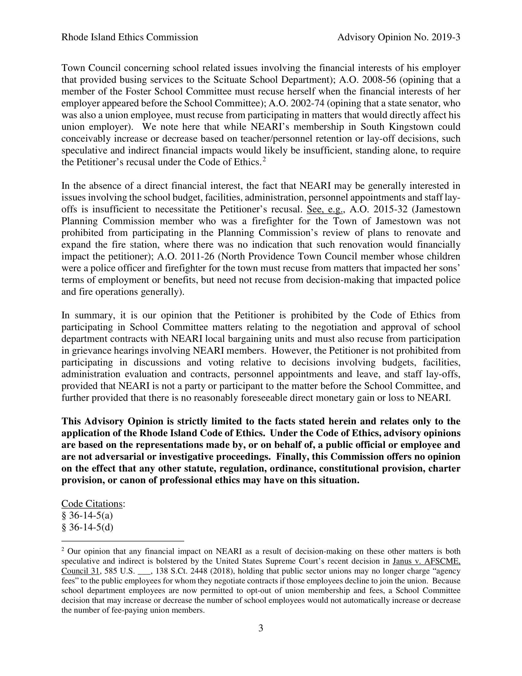 "The Petitioner is not prohibited from participating in discussions and voting relative to decisions involving budgets, facilities, administration evaluation and contracts, personnel appointments and leave, and staff lay-offs, provide that NEARI is not a party or participant to the matter before the School Committee, and further provided that there is no reasonably foreseeable directory monetary gain or loss to NEARI," wrote the Ethics Committee.