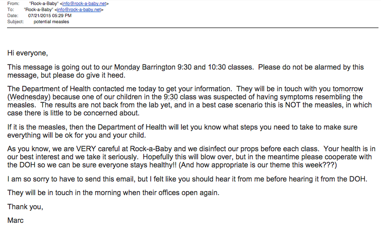 Parents of children who attended music class in Barrington were alerted on Tuesday that a possible exposure in an email -- see below.
