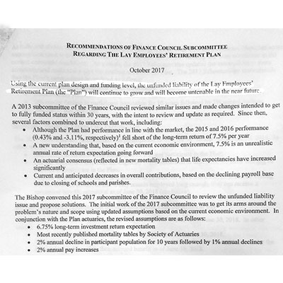 “The unfunded liability of the Lay Employees’ Retirement Plan will continue to grow and will become untenable in the near future,” states a recent Diocesan document.