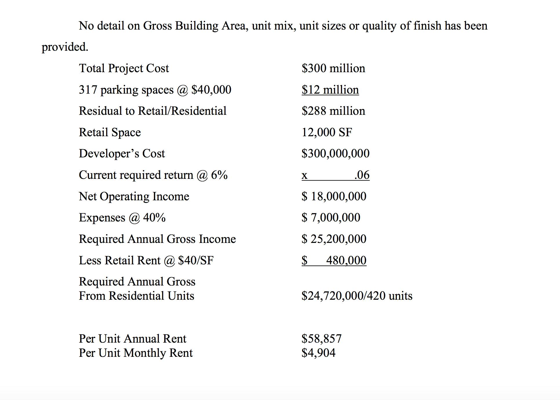 According to Scotti’s report, the rents from the project do not support the project cost and he claims the project is not financeable.