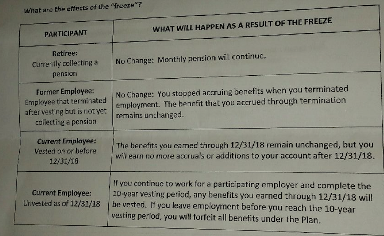 The benefits you earned through 12/31/18 remain unchanged, but you will earn no more accruals or additions to your account after 12/31/18.