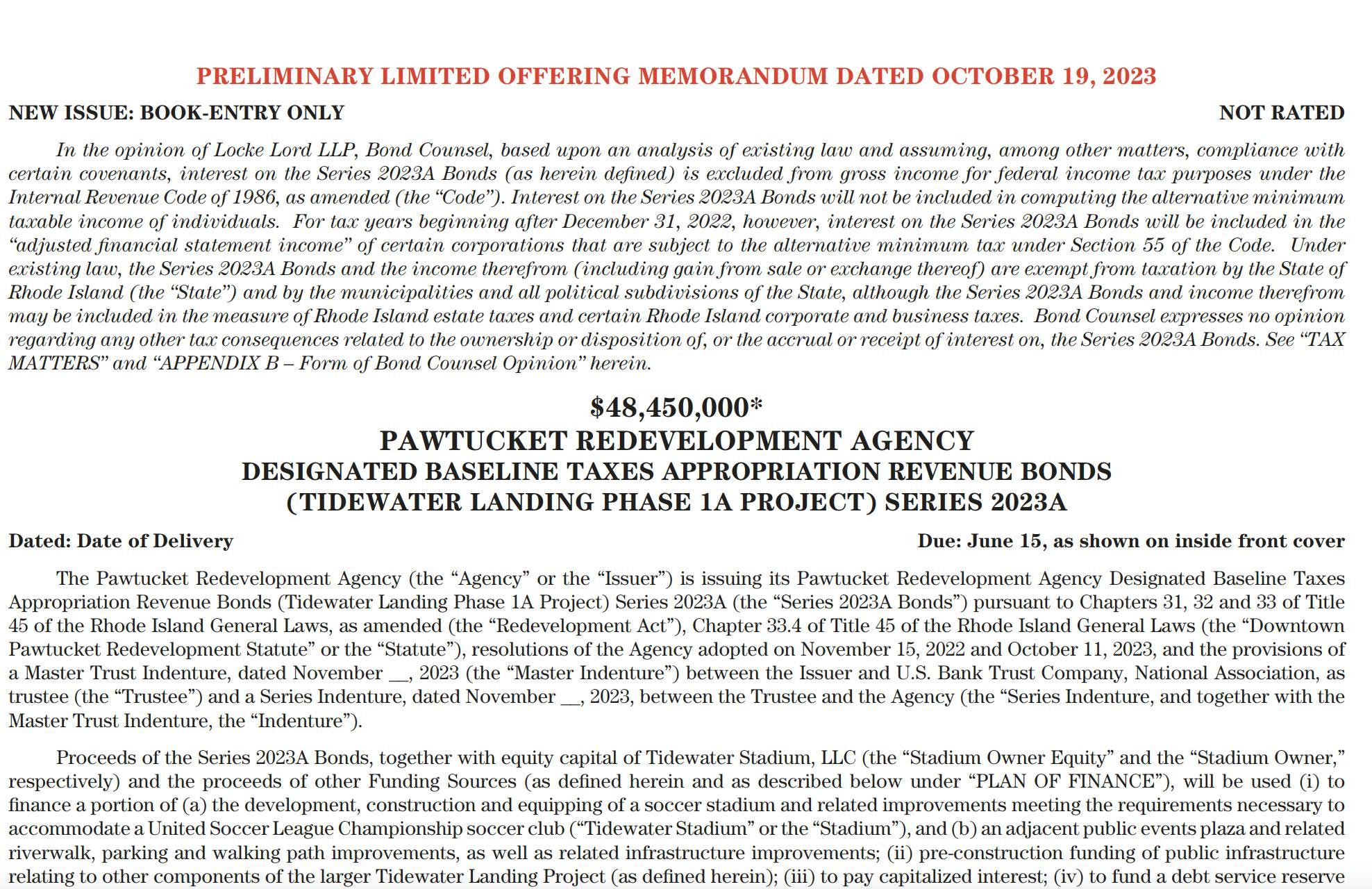 The document marked the Preliminary Limited Offering Memorandum and dated October 19, 2023, unveils that The Pawtucket Redevelopment Agency — on behalf of the city would fund the privately owned Tidewater Landing stadium.