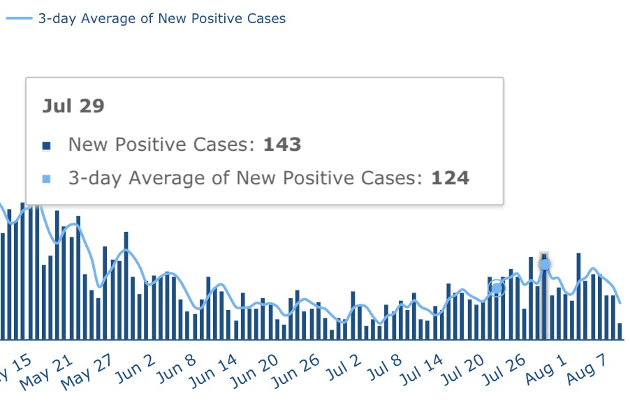 Some of the new cases announced of August 10 are likely to reflect test results going back to July 27 or older.