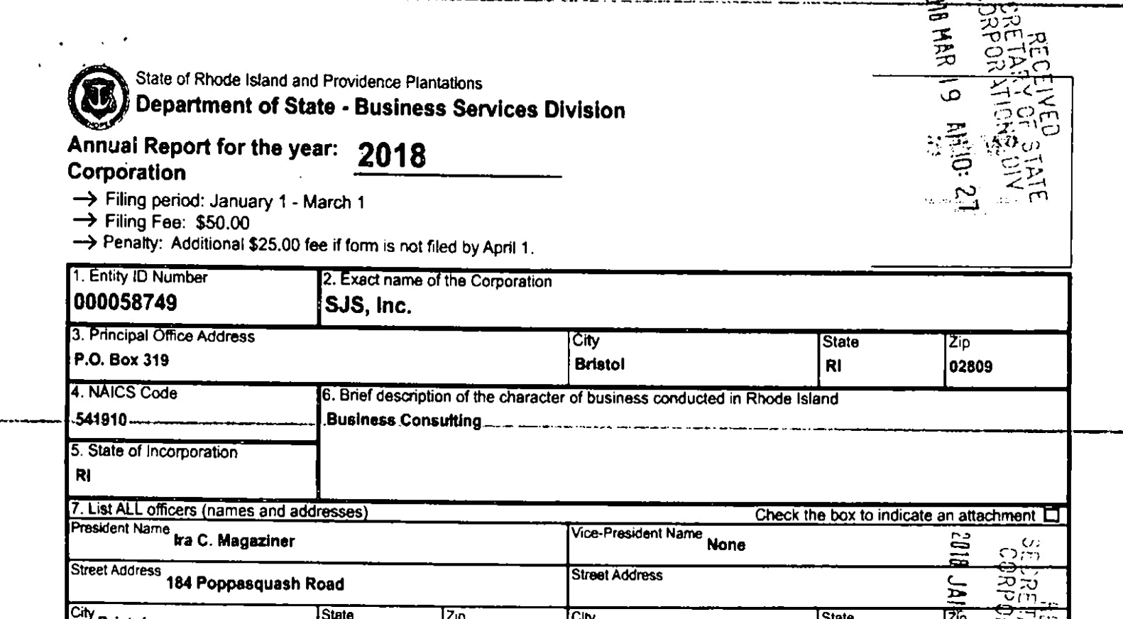 According to filings, Magaziner is the president of SJS and the address for the business is his $3 million estate owned by Magaziner on Poppasquash Point in Bristol —complete with pool and basketball court.