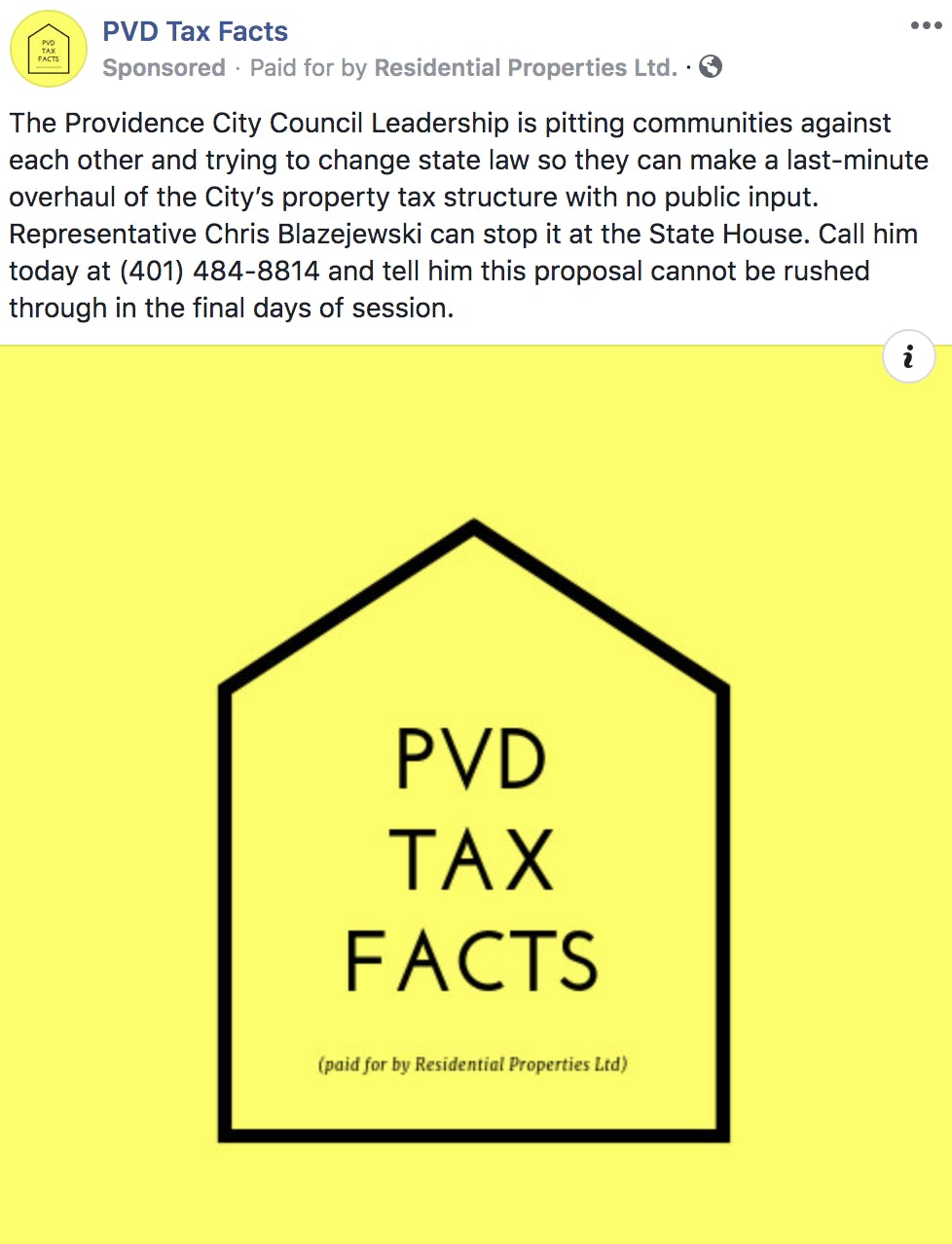 GET THE LATEST BREAKING NEWS HERE -- SIGN UP FOR GOLOCAL FREE DAILY EBLASTA campaign titled “PVD Tax Facts” claims that its mission is for “Standing up for a transparent, fair, predictable property tax structure in PVD.” The campaign is funded by Residential Properties according to the Facebook page's disclosure.