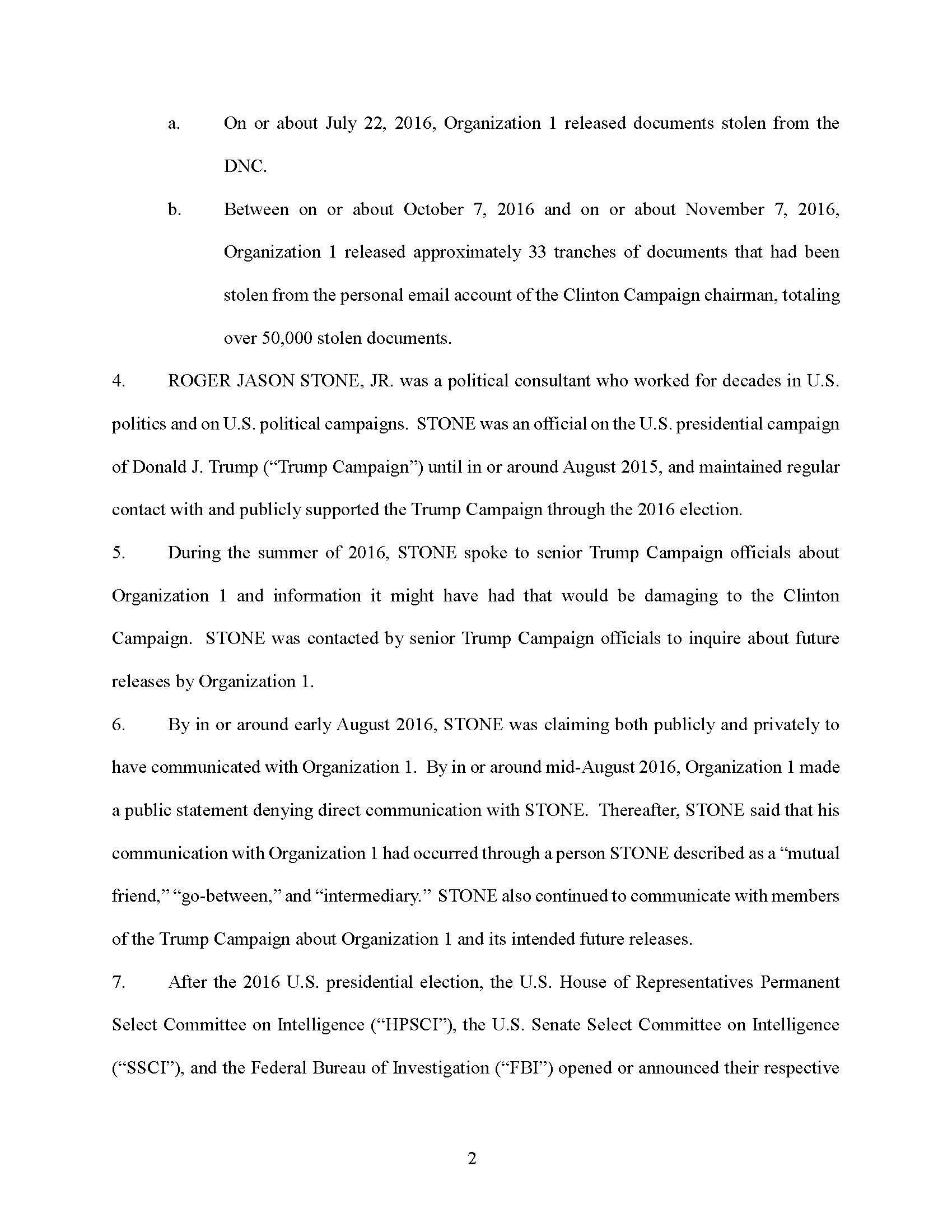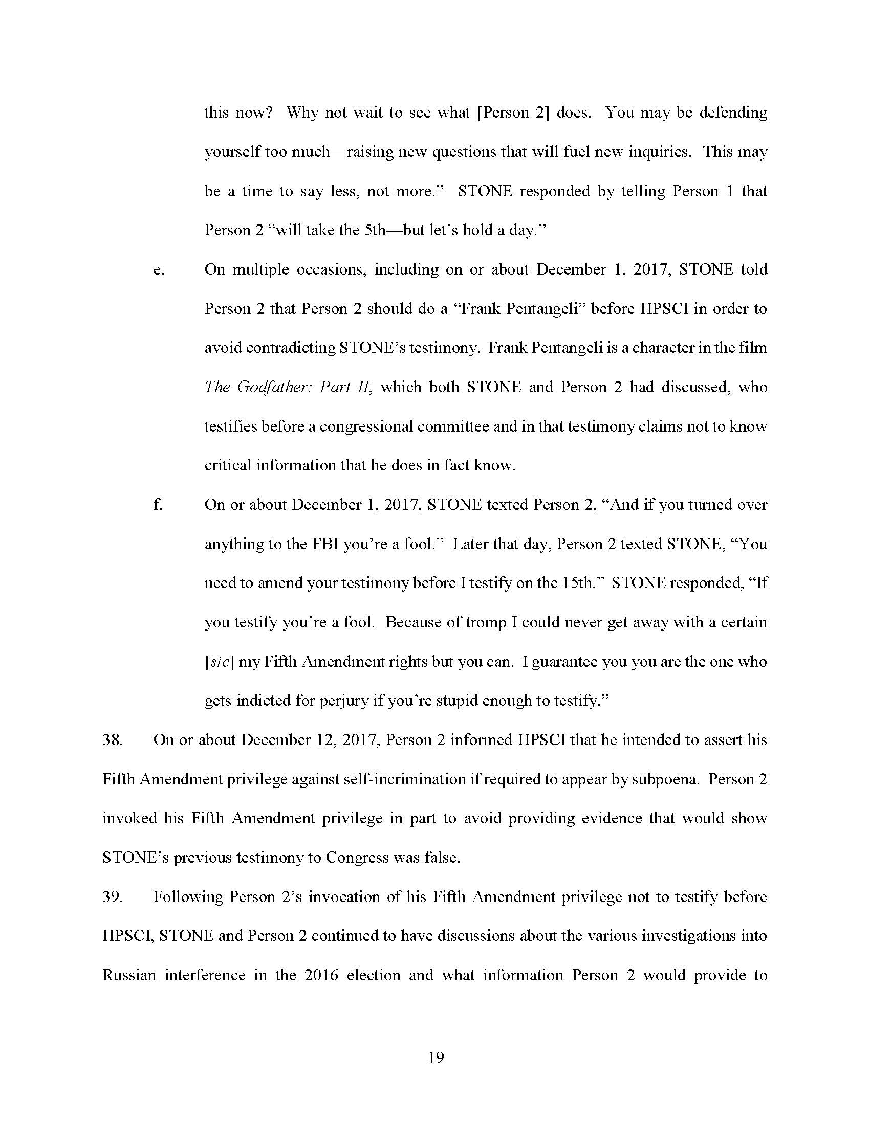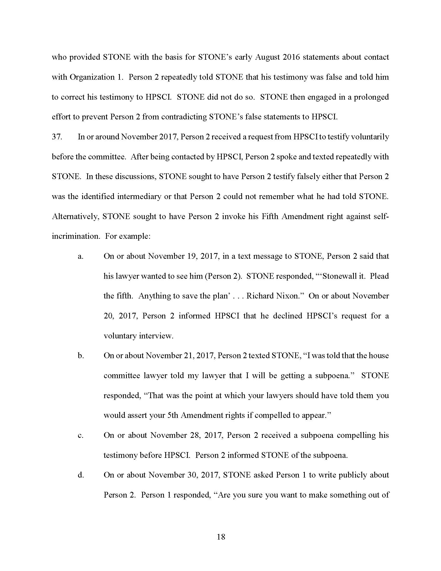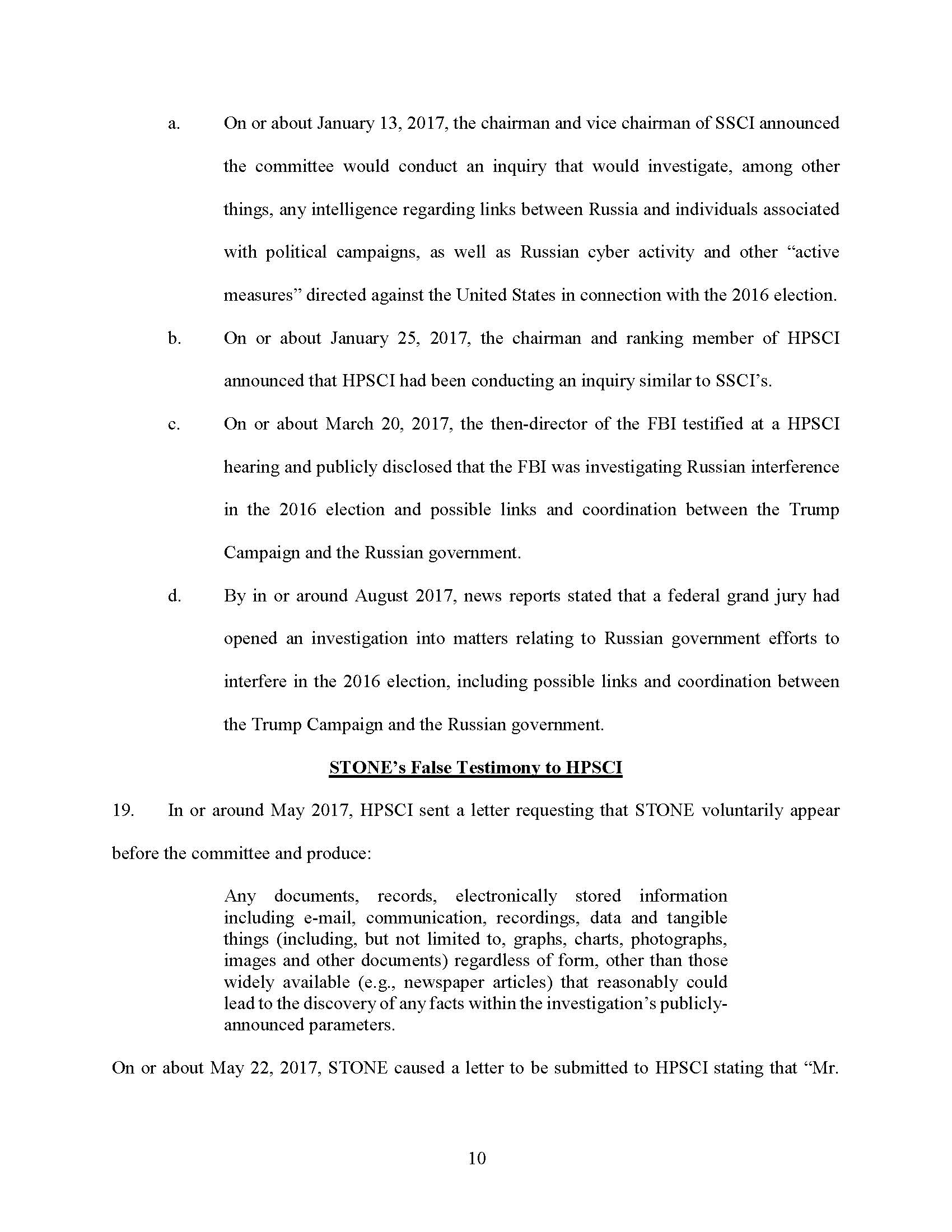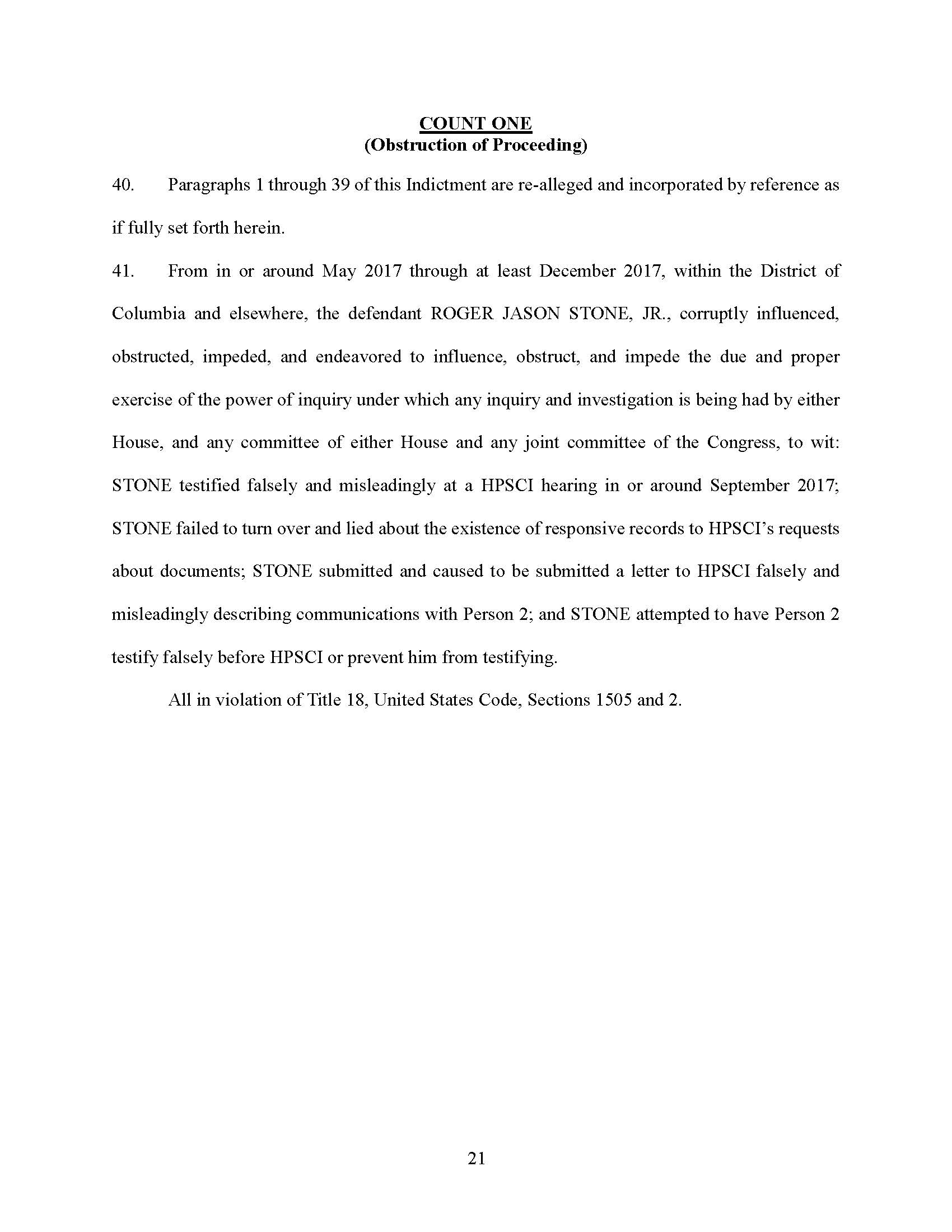 From in or around May 2017 through at least December 2017, within the District of Columbia and elsewhere, the defendant ROGER JASON STONE, JR., corruptly influenced, obstructed, impeded, and endeavored to influence, obstruct, and impede the due and proper exercise of the power of inquiry under which any inquiry and investigation is being had by either House, and any committee of either House and any joint committee of the Congress, to wit: STONE testified falsely and misleadingly at a HPSCI hearing in or around September 2017; STONE failed to turn over and lied about the existence of responsive records to HPSCI’s requests about documents; STONE submitted and caused to be submitted a letter to HPSCI falsely and misleadingly describing communications with Person 2; and STONE attempted to have Person 2 testify falsely before HPSCI or prevent him from testifying. All in violation of Title 18, United States Code, Sections 1505 and 2.