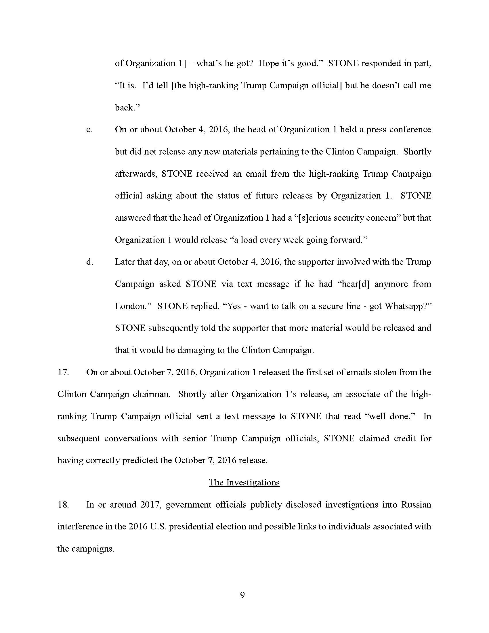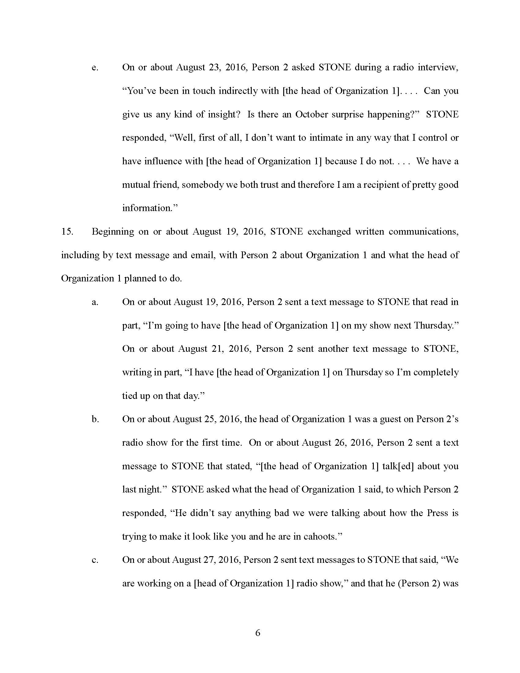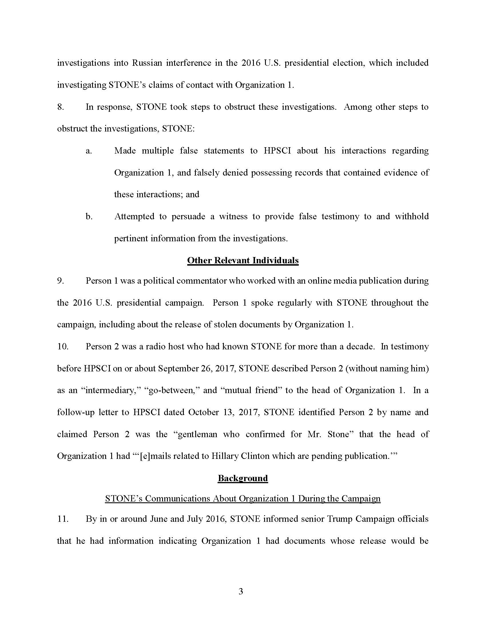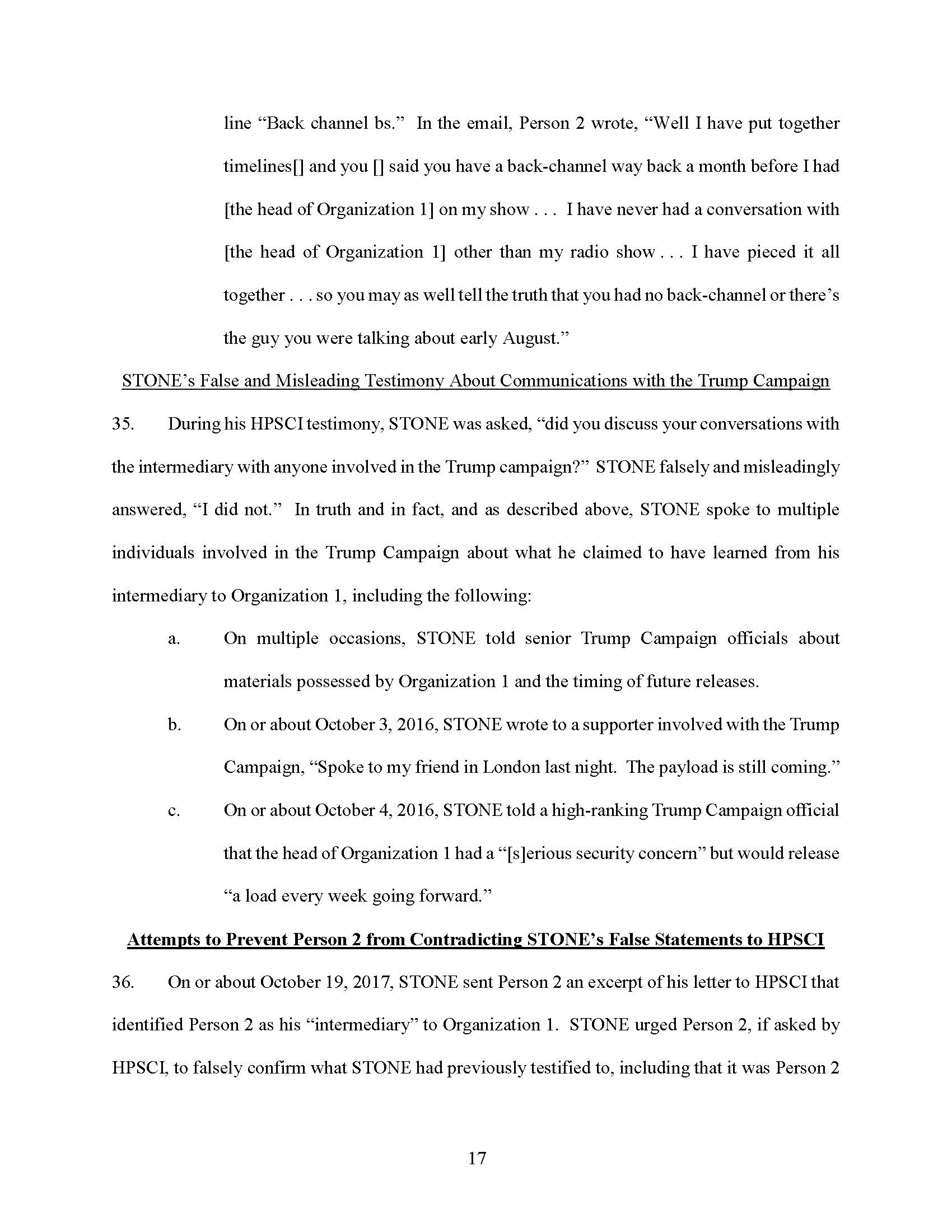 STONE testified falsely that he had never discussed his conversations with the person he referred to as his “go-between,” “mutual friend,” and “intermediary” with anyone involved in the Trump Campaign.