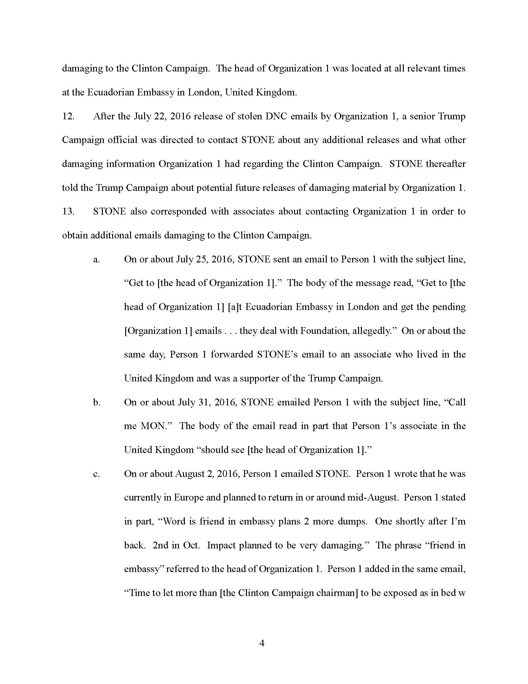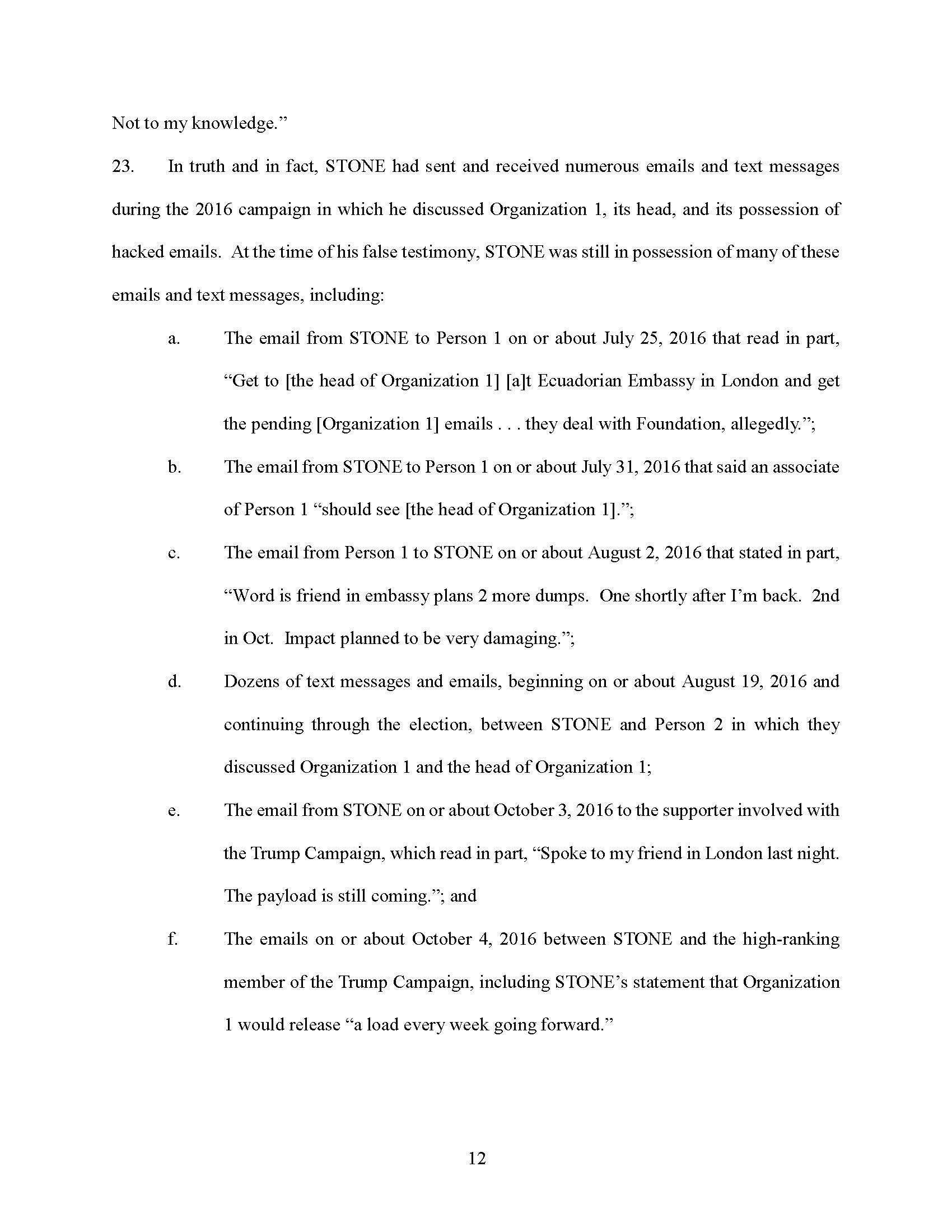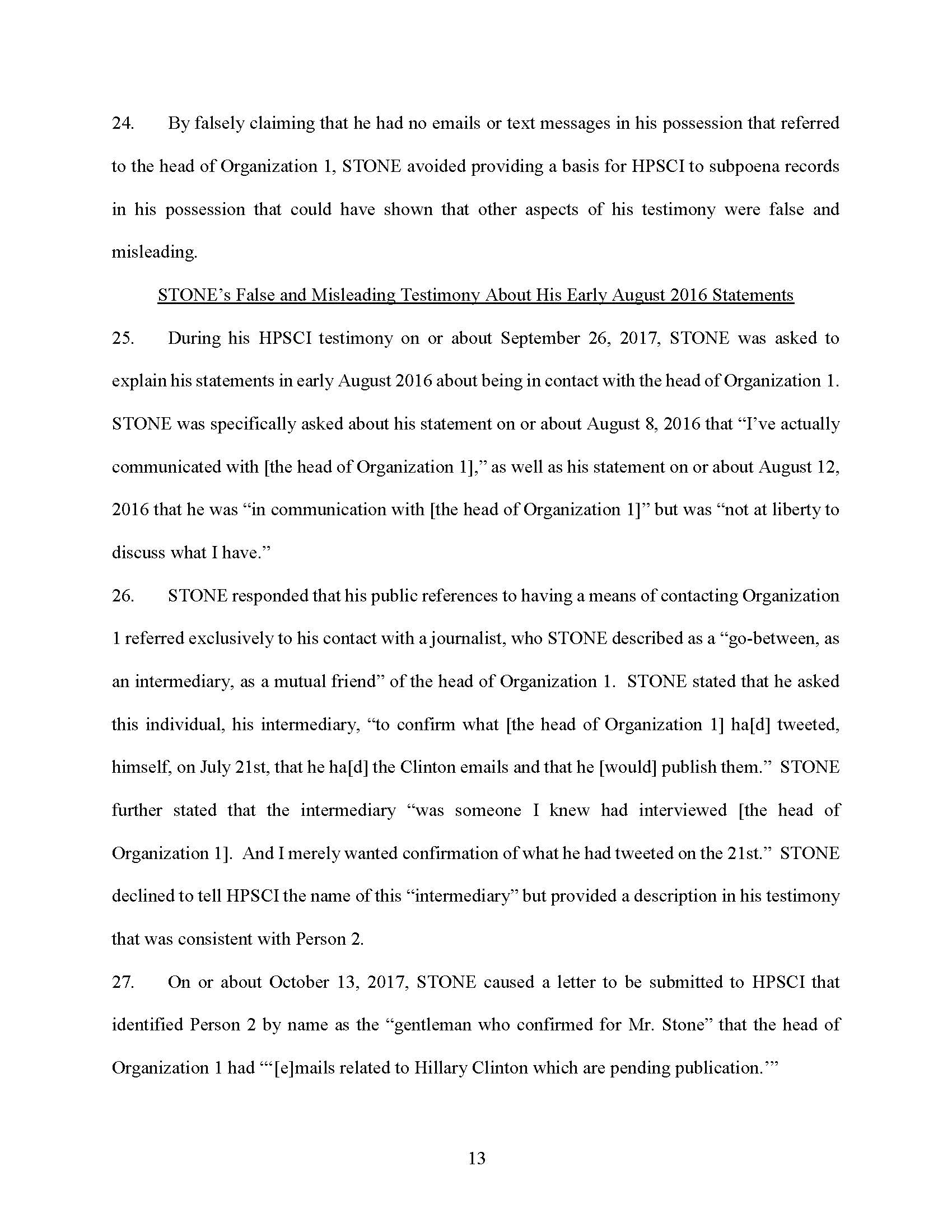 STONE testified falsely that he did not have emails with third parties about the head of Organization 1, and that he did not have any documents, emails, or text messages that refer to the head of Organization 1.