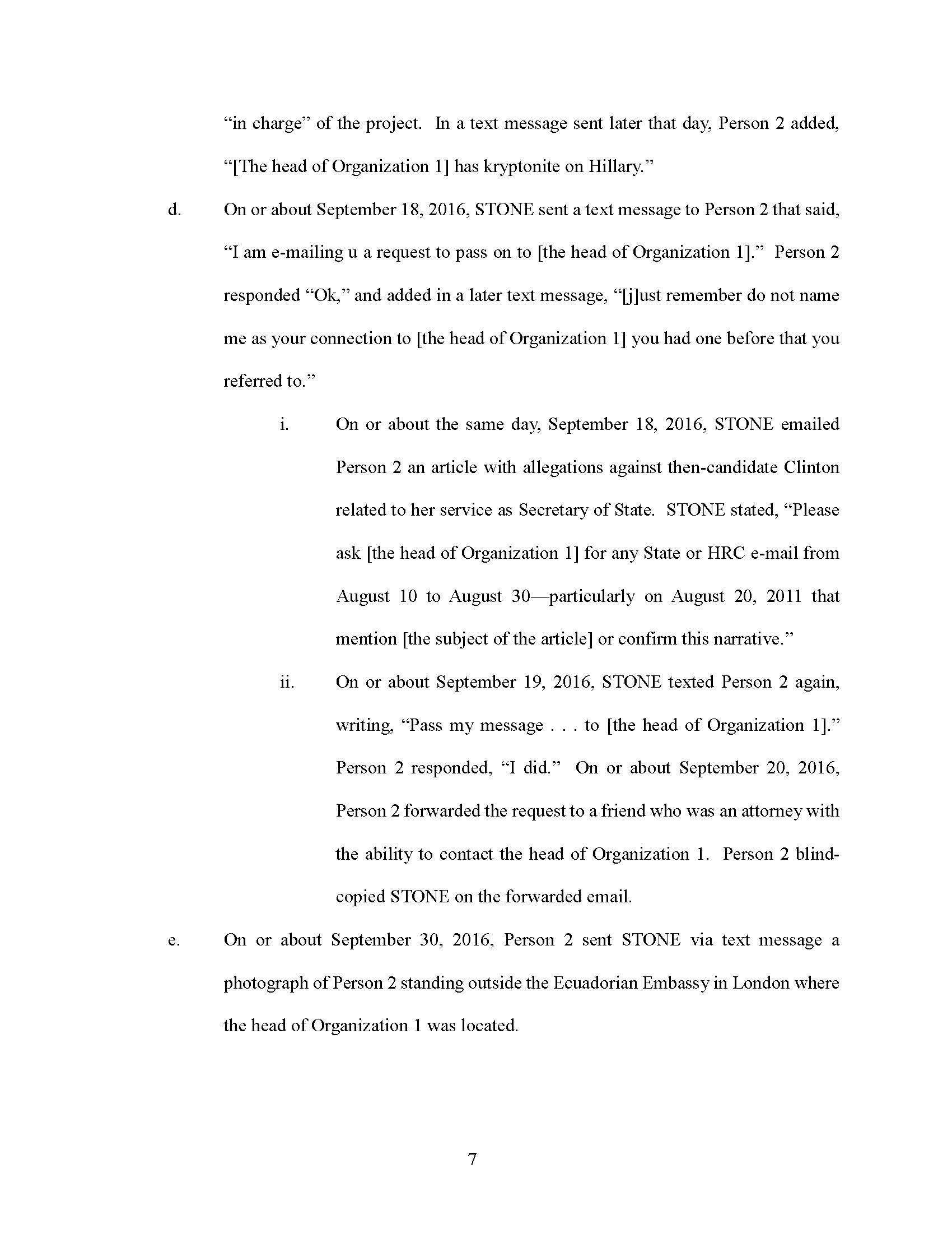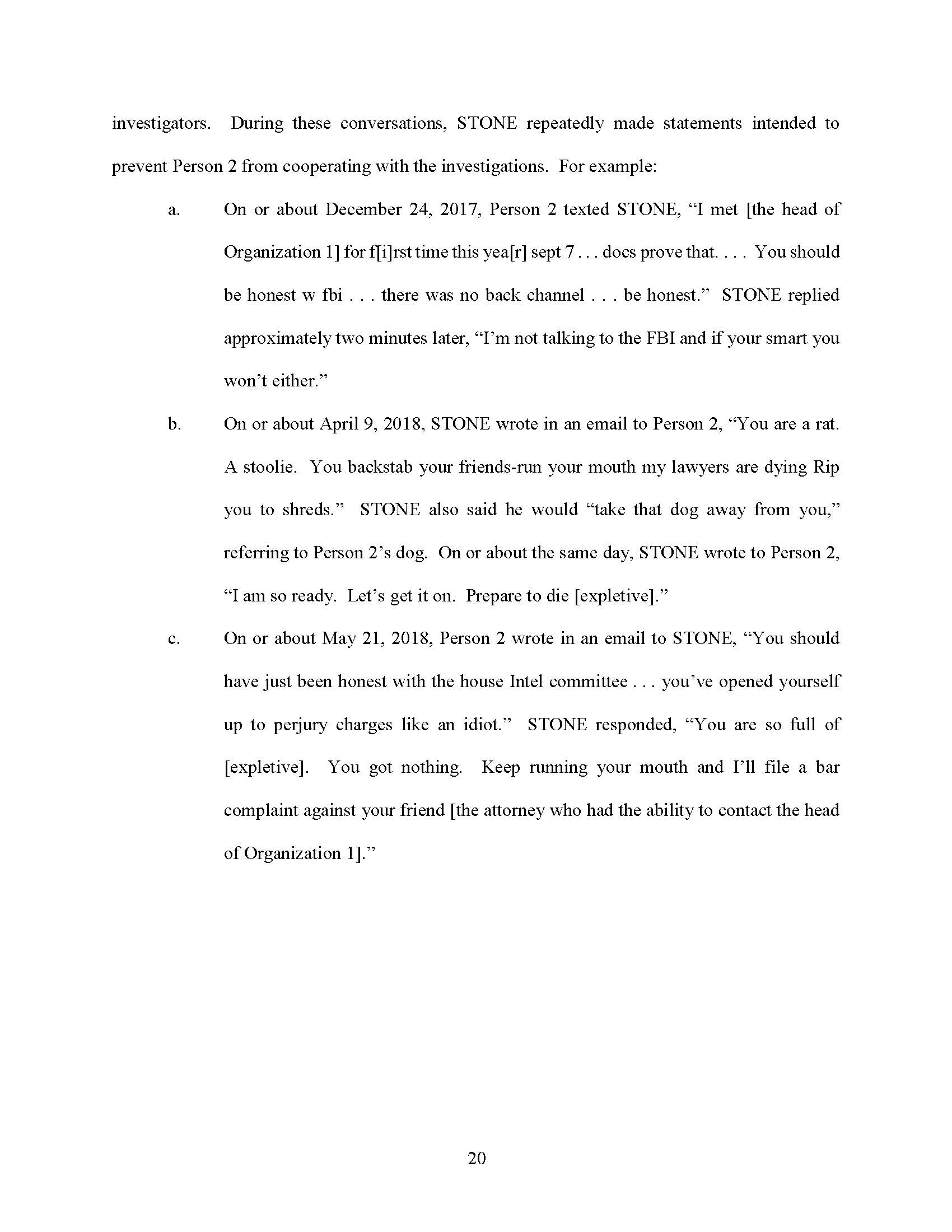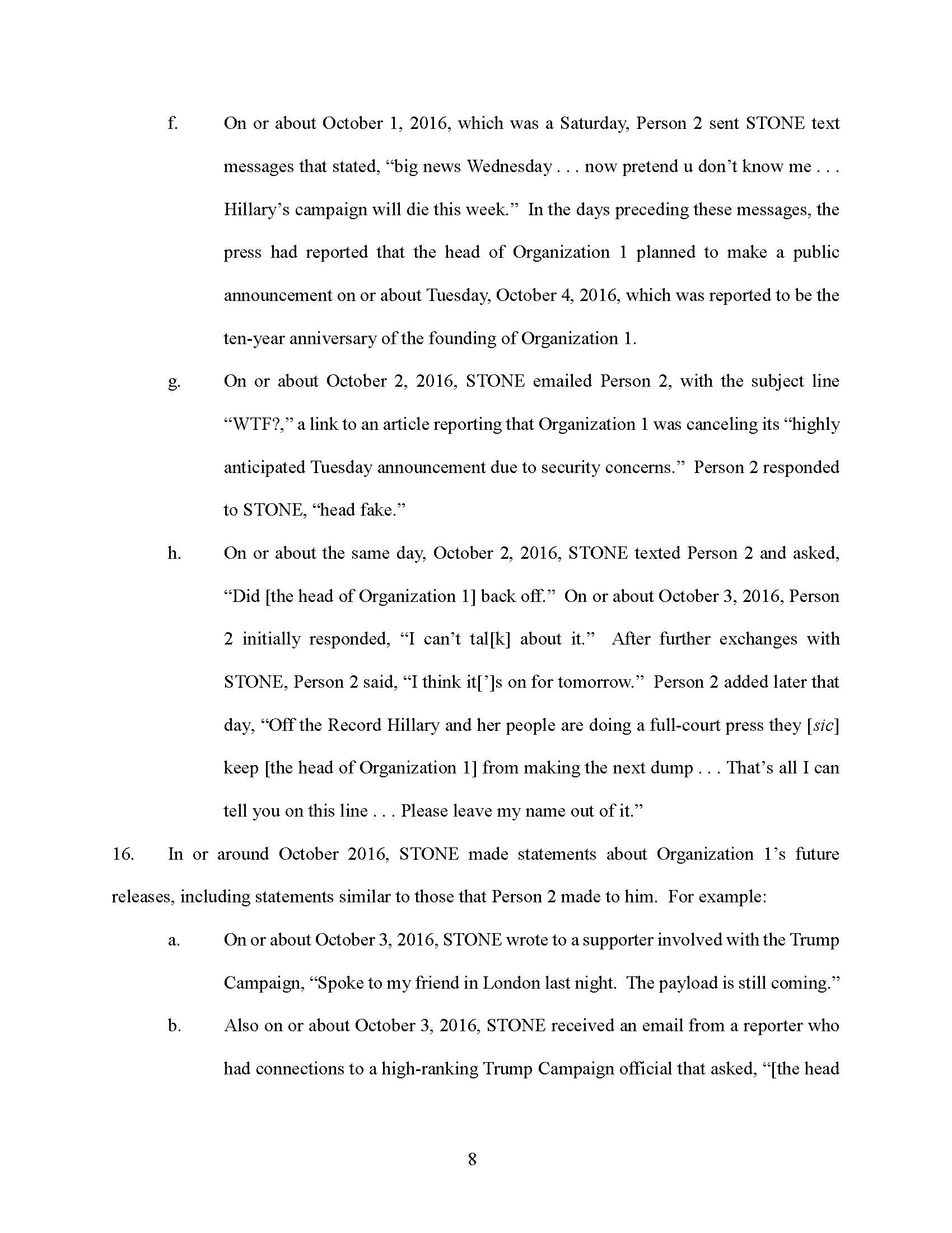 STONE testified falsely that he did not have emails with third parties about the head of Organization 1, and that he did not have any documents, emails, or text messages that refer to the head of Organization 1.