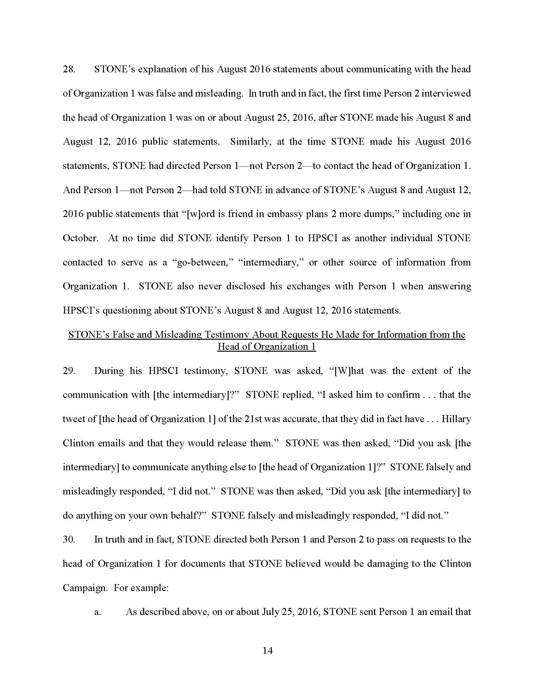 STONE testified falsely that his August 2016 references to being in contact with the head of Organization 1 were references to communications with a single “go-between,” “mutual friend,” and “intermediary,” who STONE identified as Person 2.