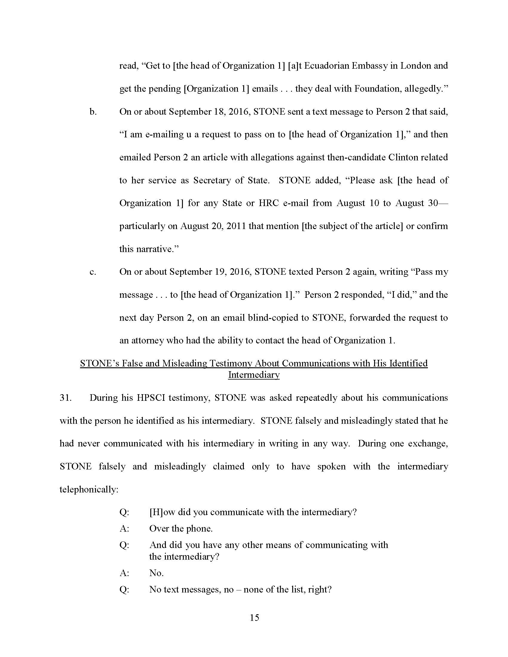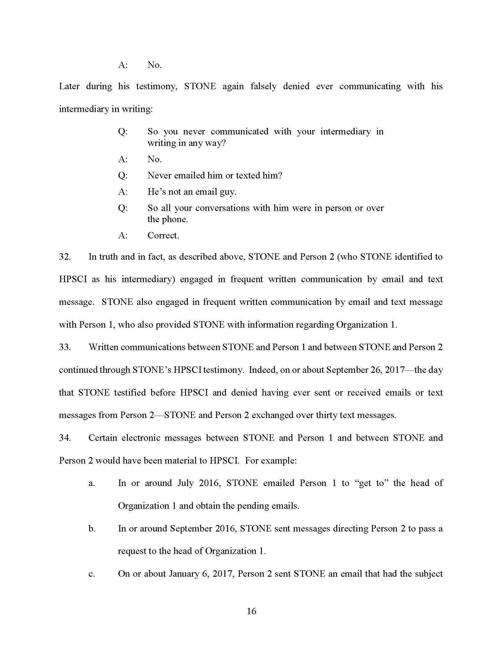 STONE testified falsely that he and the person he referred to as his “go-between,” “mutual friend,” and “intermediary” did not communicate via text message or email about Organization 1.