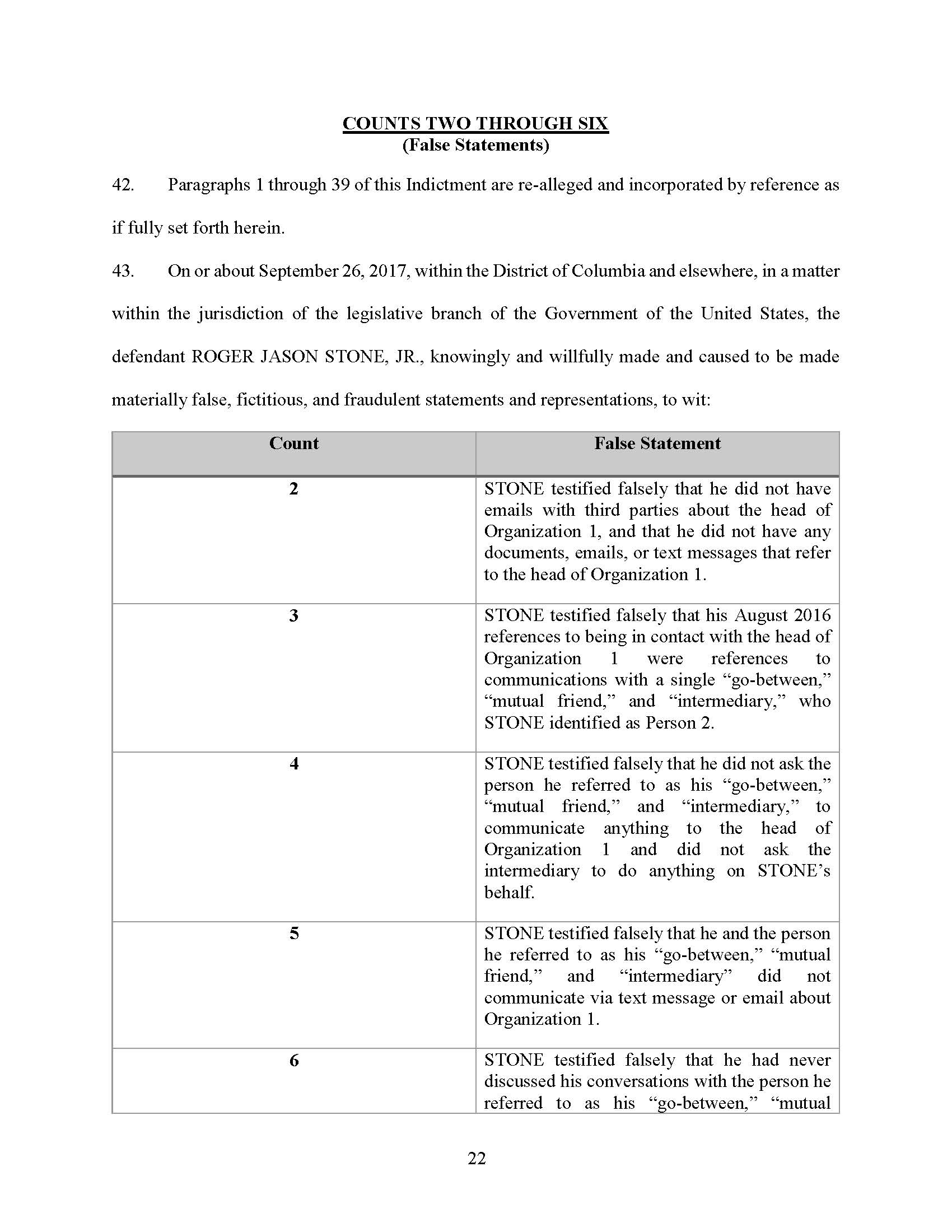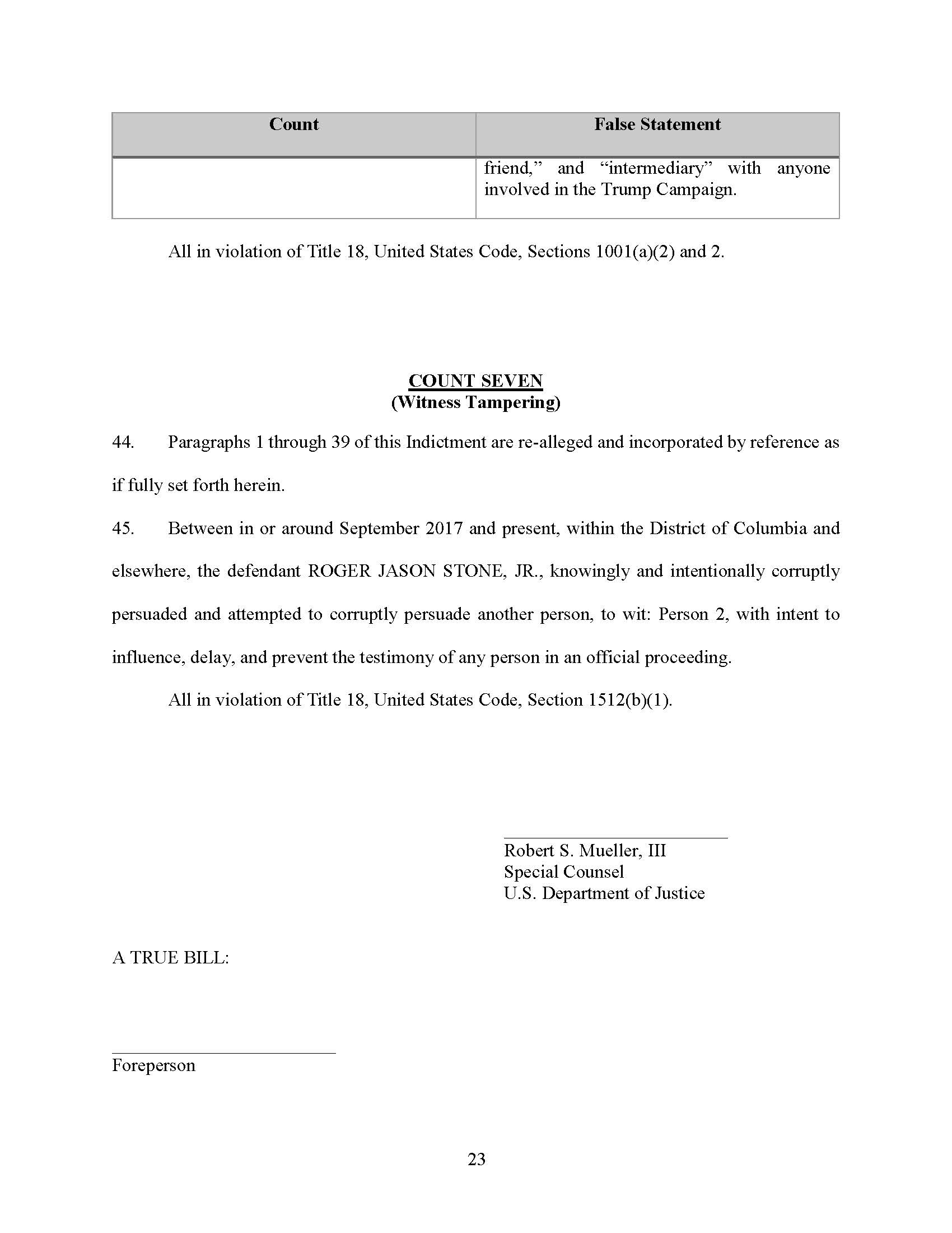 Paragraphs 1 through 39 of this Indictment are re-alleged and incorporated by reference as if fully set forth herein. Between in or around September 2017 and present, within the District of Columbia and elsewhere, the defendant ROGER JASON STONE, JR., knowingly and intentionally corruptly persuaded and attempted to corruptly persuade another person, to wit: Person 2, with intent to influence, delay, and prevent the testimony of any person in an official proceeding. All in violation of Title 18, United States Code, Section 1512(b)(1).