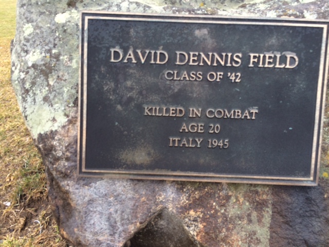 The stone sits on the green playing fields of Milton Academy in silent and eloquent tribute to the brutal cost of a brutal war. Read the inscription and let your mind drift over the facts—David Dennis, Class of ’42, killed in combat, age 20, Italy, 1945.