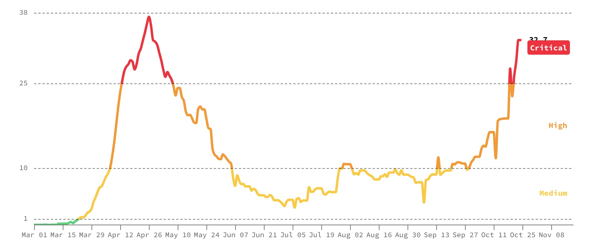 Covid ActNow last week ranked Rhode Island as being in the outbreak level and has designated the state's rate of daily new cases, which is now 32.7 per 100,000 as a “dangerous number of new cases.”