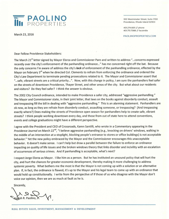 "The March 21 letter signed by [Elorza and Pare]...had me concerned right off the bat," wrote Paolino. "Because the only concerns I"m aware of address the city's lack of enforcement of the panhandling ordinance"