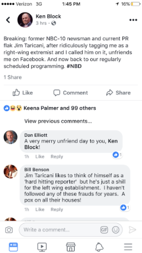 Breaking: former NBC-10 newsman and current PR flak Jim Taricani, after ridiculously tagging me as a right-wing extremist and I called him on it, unfriends me on Facebook. And now back to our regularly scheduled programming. #NBD