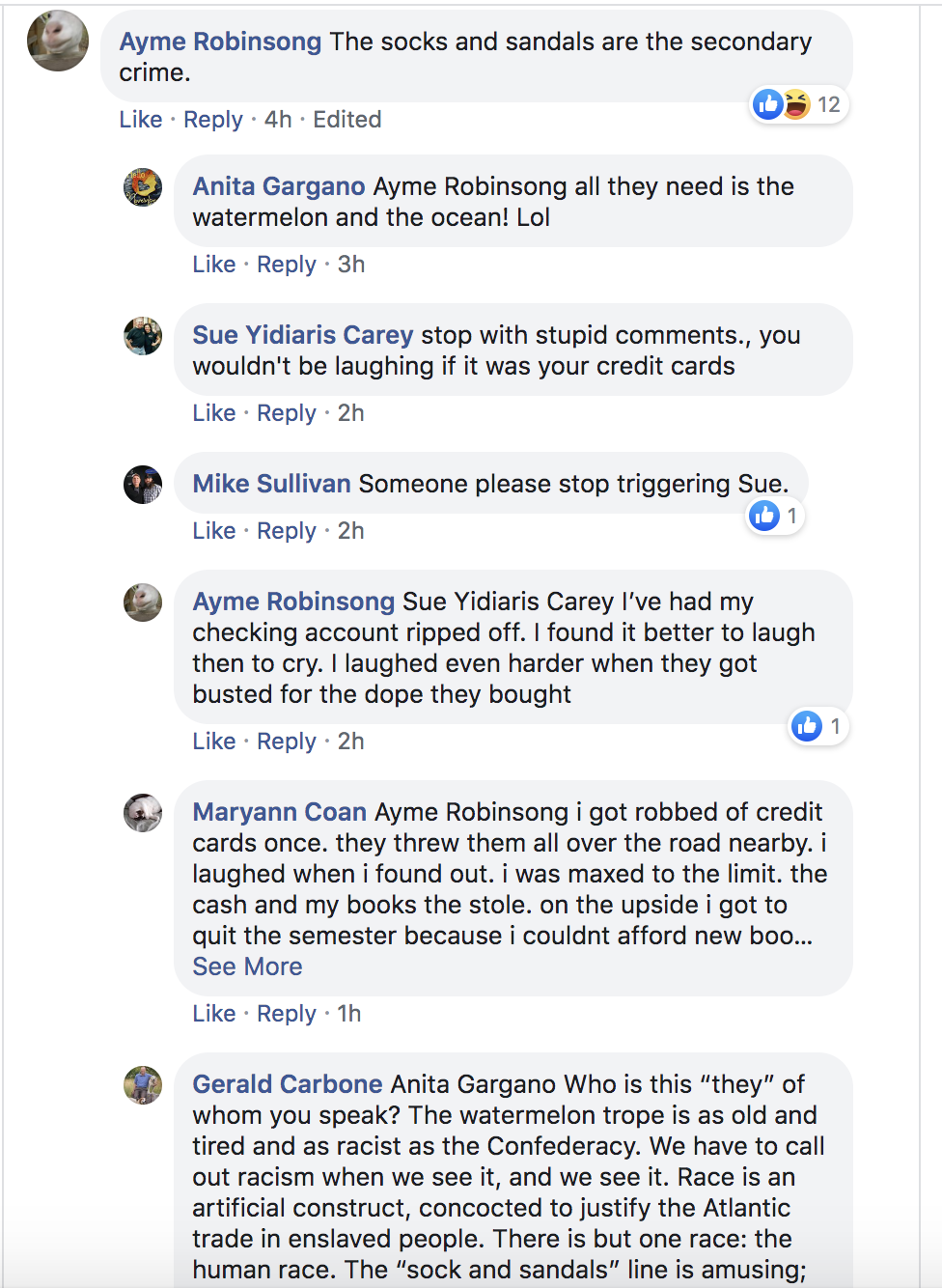 “I’d be surprised, happily, if the number of posts featuring non-whites is commensurate with the data of crimes allegedly committed by non-white people,” said Carbone. “Even if that were the case, which I doubt, these posts elicit comments about perceived legal status, 'scum,' and other disturbing racial tropes that the police department leaves up unchallenged."