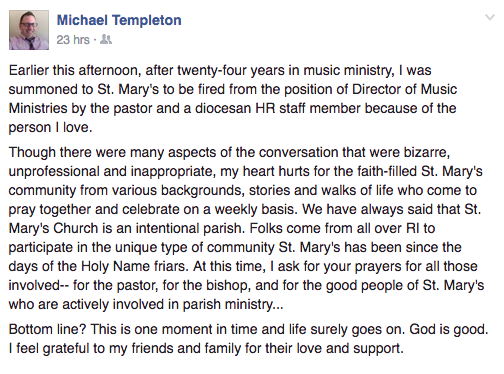 In a statement posted to Facebook on Tuesday, Michael Templeton, who resides in Warren, spoke to a conversation with church clergy that he said was "bizarre, unprofessional, and inappropriate," which led to his firing as Music Director at the Catholic church, where he served for more than five years.