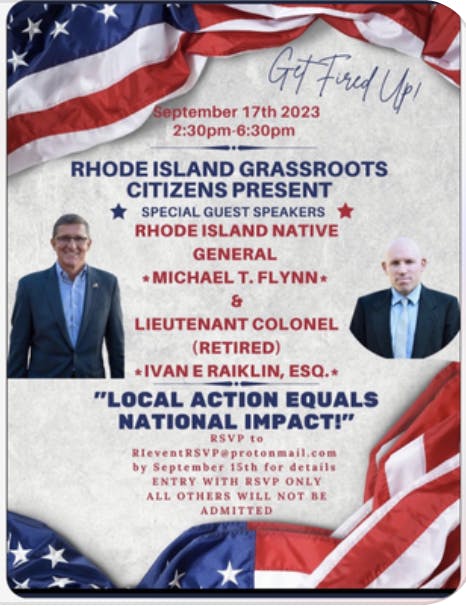 Flynn is scheduled to be at the Park Theatre in Cranston on Sunday at 3 PM for the event titled “Local Action Equals National Impact,” hosted by a group called “Rhode Island Grassroots Citizens.”