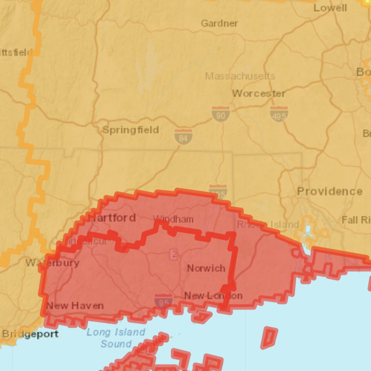 The National Weather Service on Friday provided a map of where Henri is expected to hit on Sunday -- the red zone is where winds could reach 74 to 100 miles per hour; the orange, 54 to 73 miles per hour.