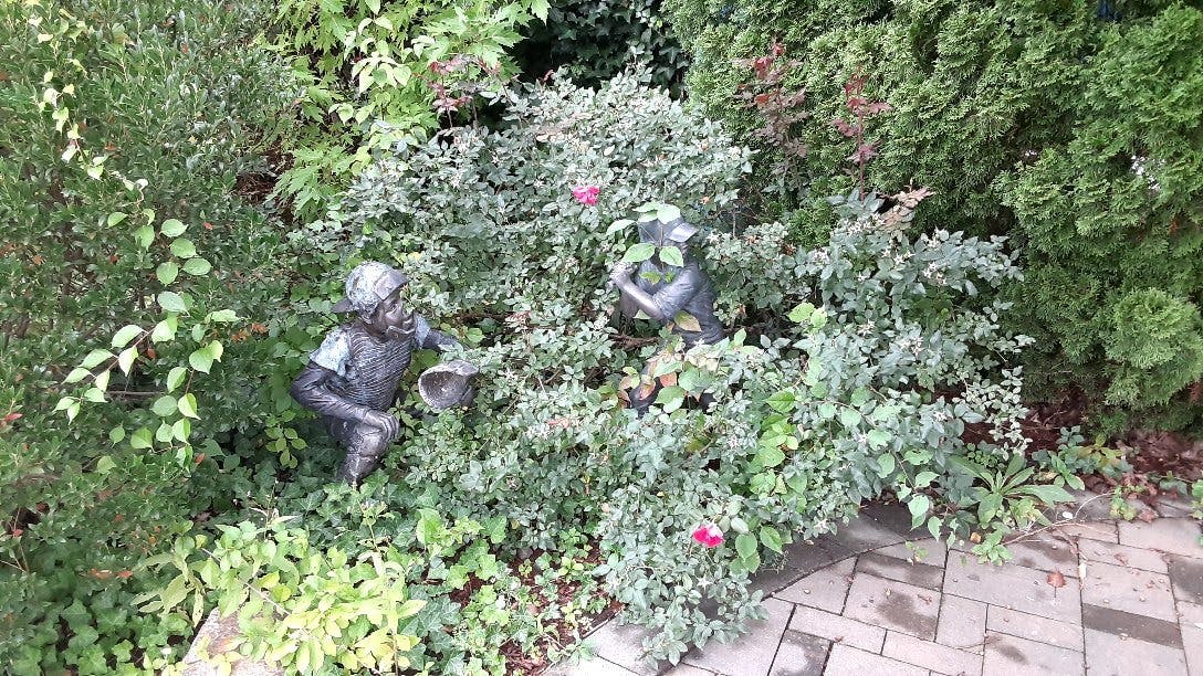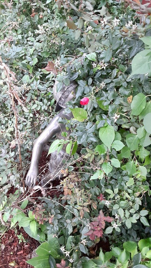 The beloved statue area is overgrown and covered in weeds in many areas.