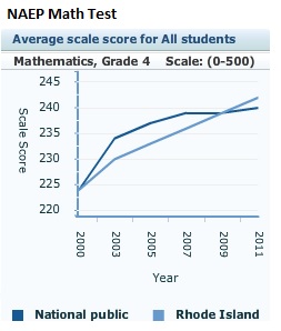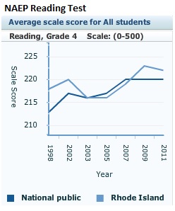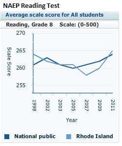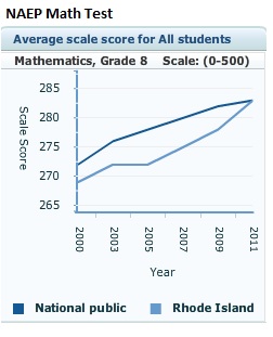 These test results reinforce what the NECAP shows: overall, Ocean State students are improving. In 2011, for the first time, Rhode Island fourth and eighth graders were “at or above the national average” the math and reading tests, noted RIDE spokesman Elliot Krieger. (See charts for more.)