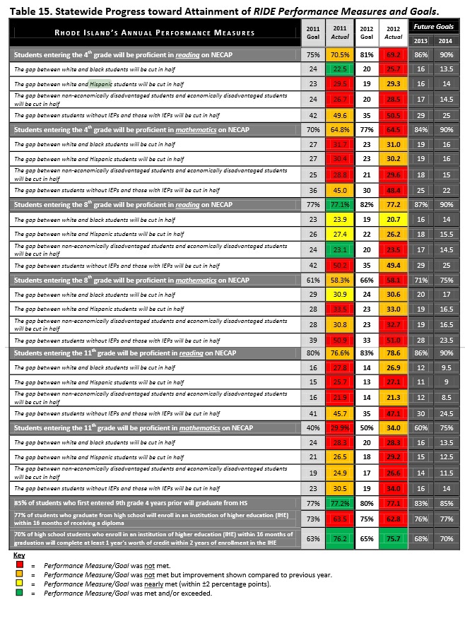 Note: The first two tables show NECAP results for reading and math. The third table is the list of RIDE goals for student performance. The numbers listed are percentages. The NECAP was taken in the fall of each listed year. For example, the numbers for 2012 would correspond to the 2012-2013 school year.