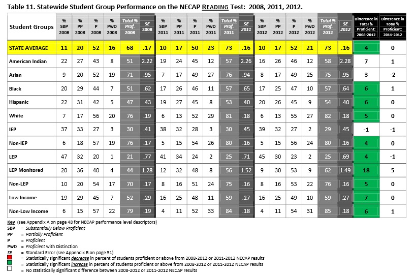 ■ NECAP reading: the white to non-native English speaker gap increased from 55 to 57 points