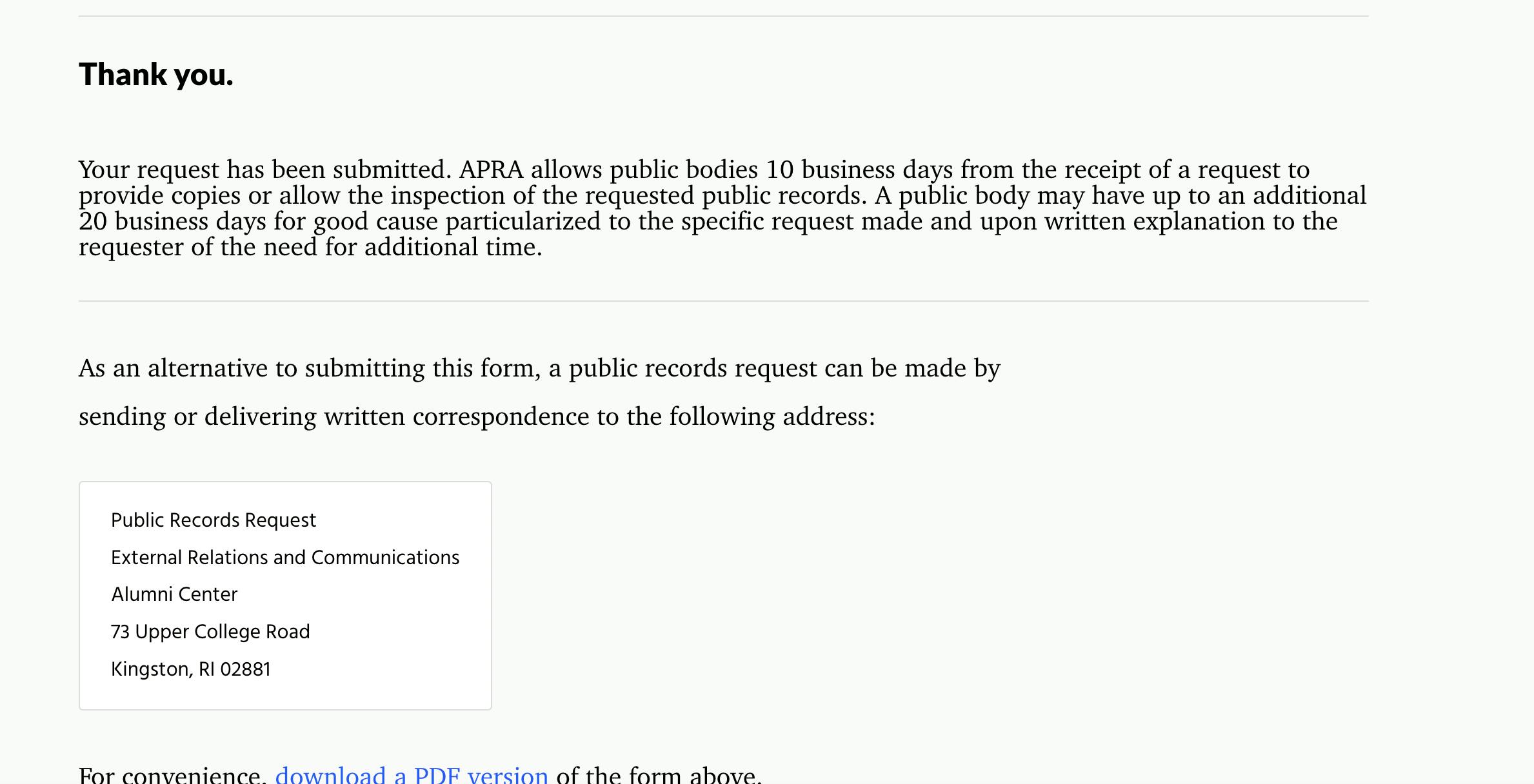 GET THE LATEST BREAKING NEWS HERE -- SIGN UP FOR GOLOCAL FREE DAILY EBLASTBy law, the University had ten days to respond to the request. GoLocal received no response and weeks later, the URI admitted it failed to respond.