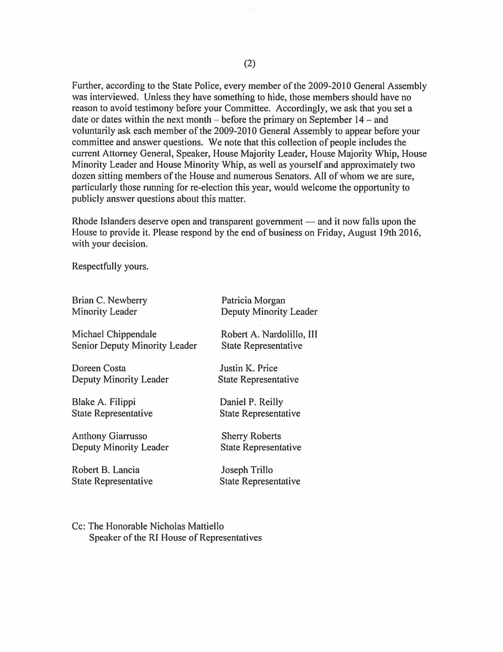 I would like to publicly call on Speaker Mattiello to step up and follow the advice of his opponent Steven Frias and “ask the House Oversight Committee to begin a full investigation into 38 Studios and use its subpoena powers to obtain documentation collected by State Police and the R.I. Attorney General related to 38 Studios.”
