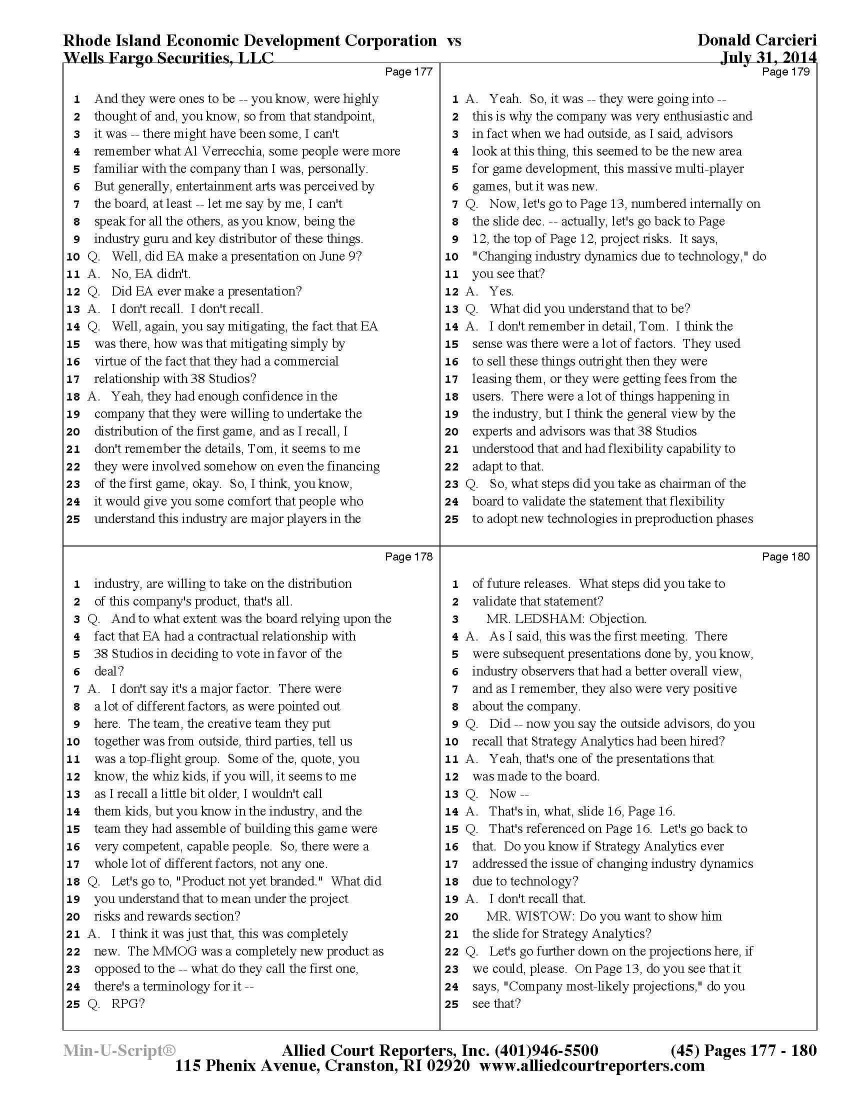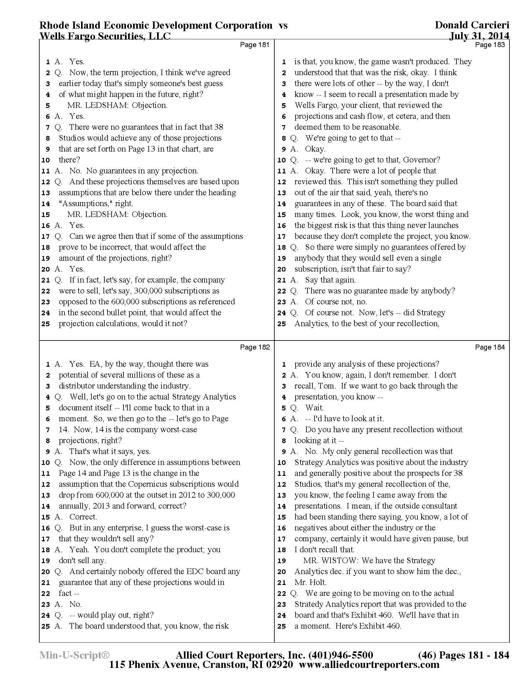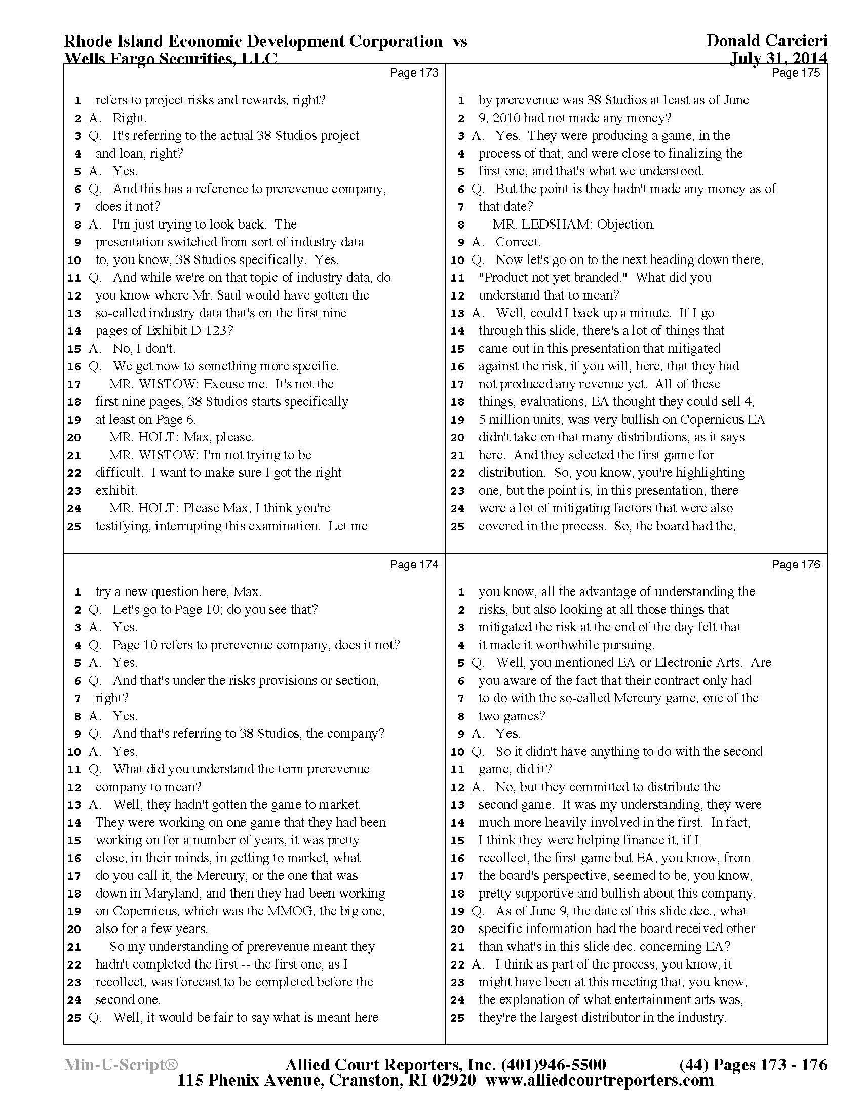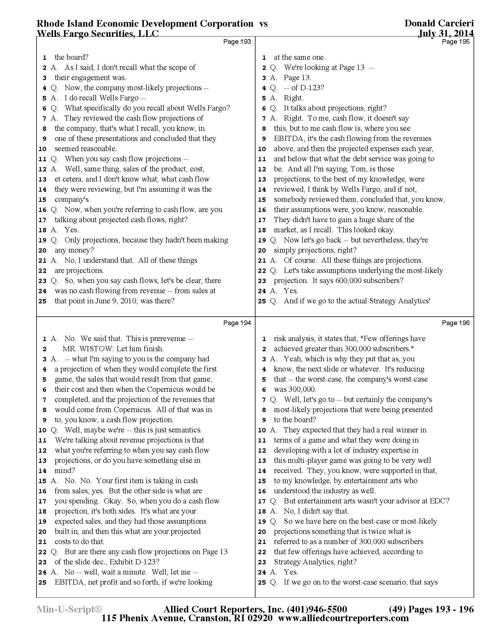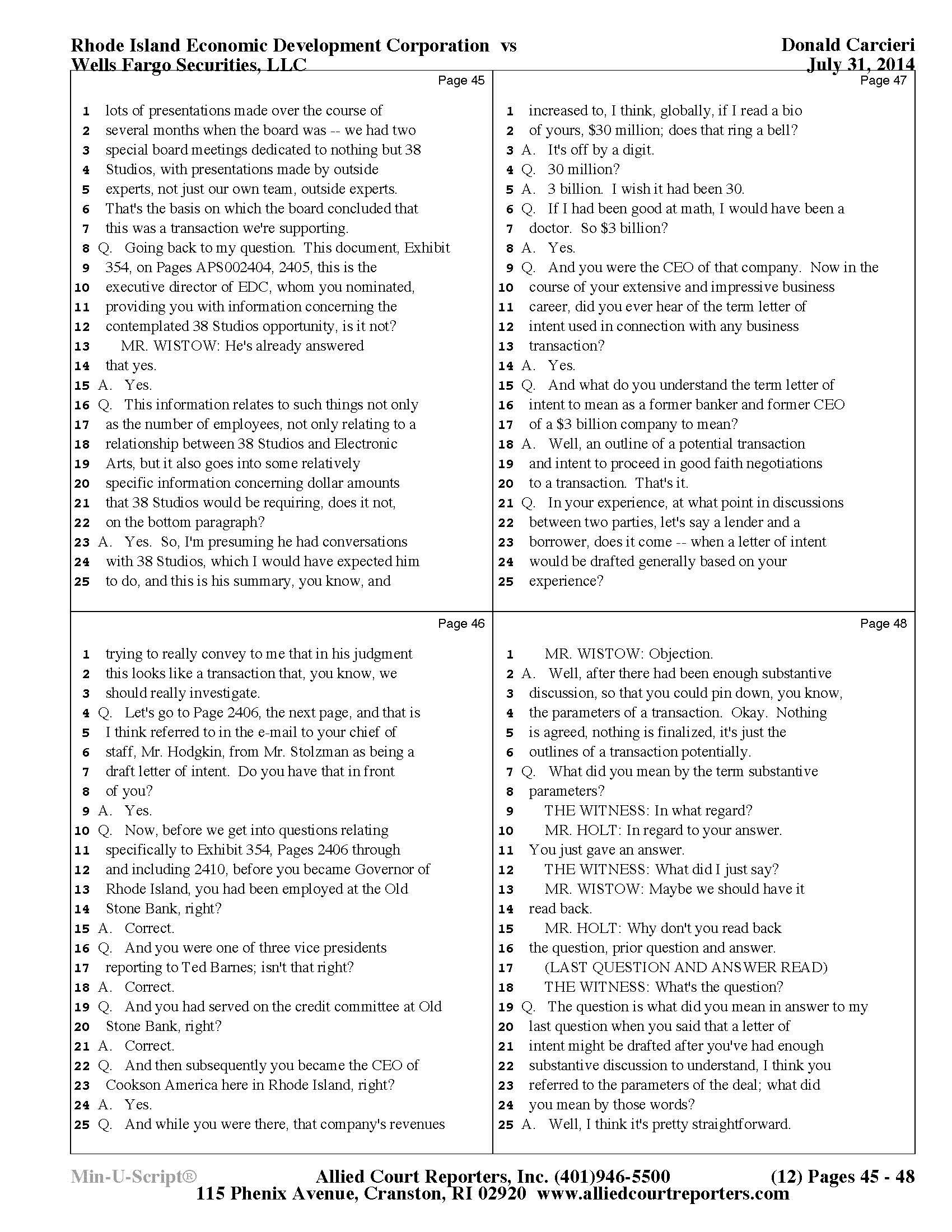 In the course of the deposition Carcieri is asked by Attorney Holt representing Wells Fargo, “38 Studios conservatively estimated gross revenues on the first phase of the game at approximately $450 million through 2015, [how] do you see that?”