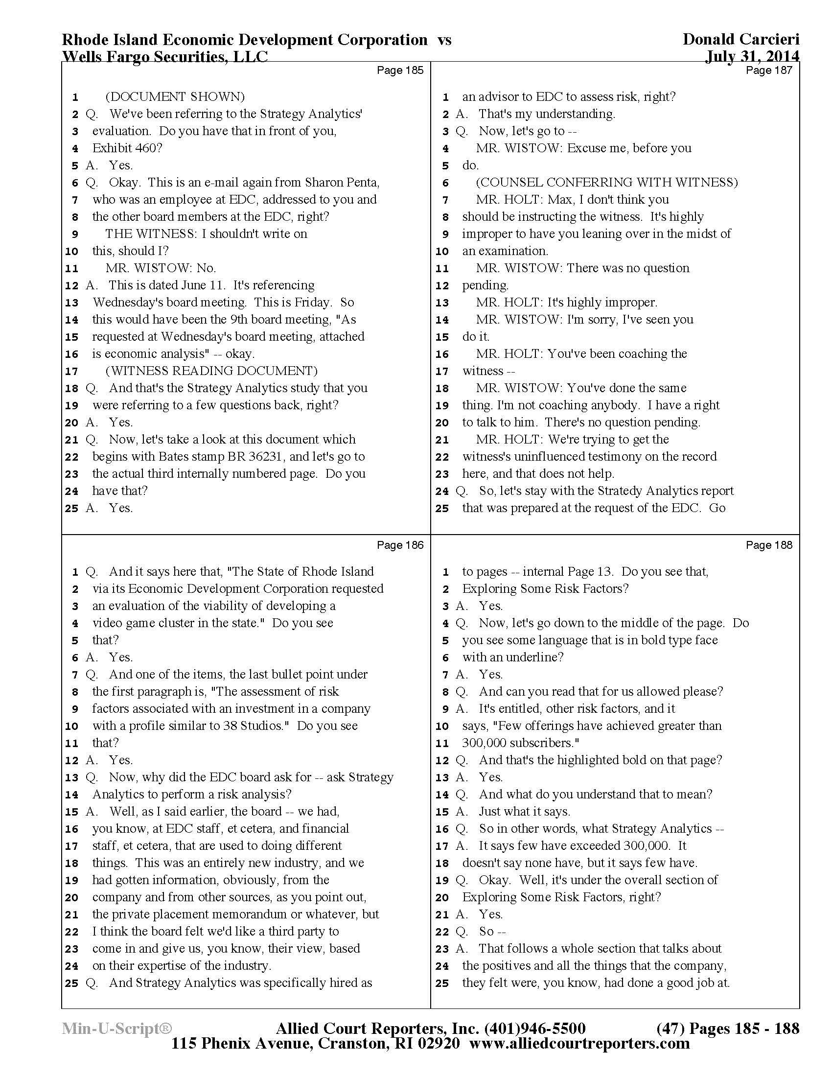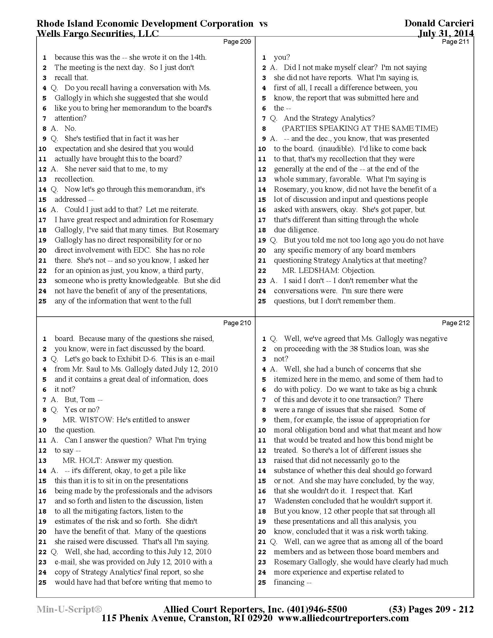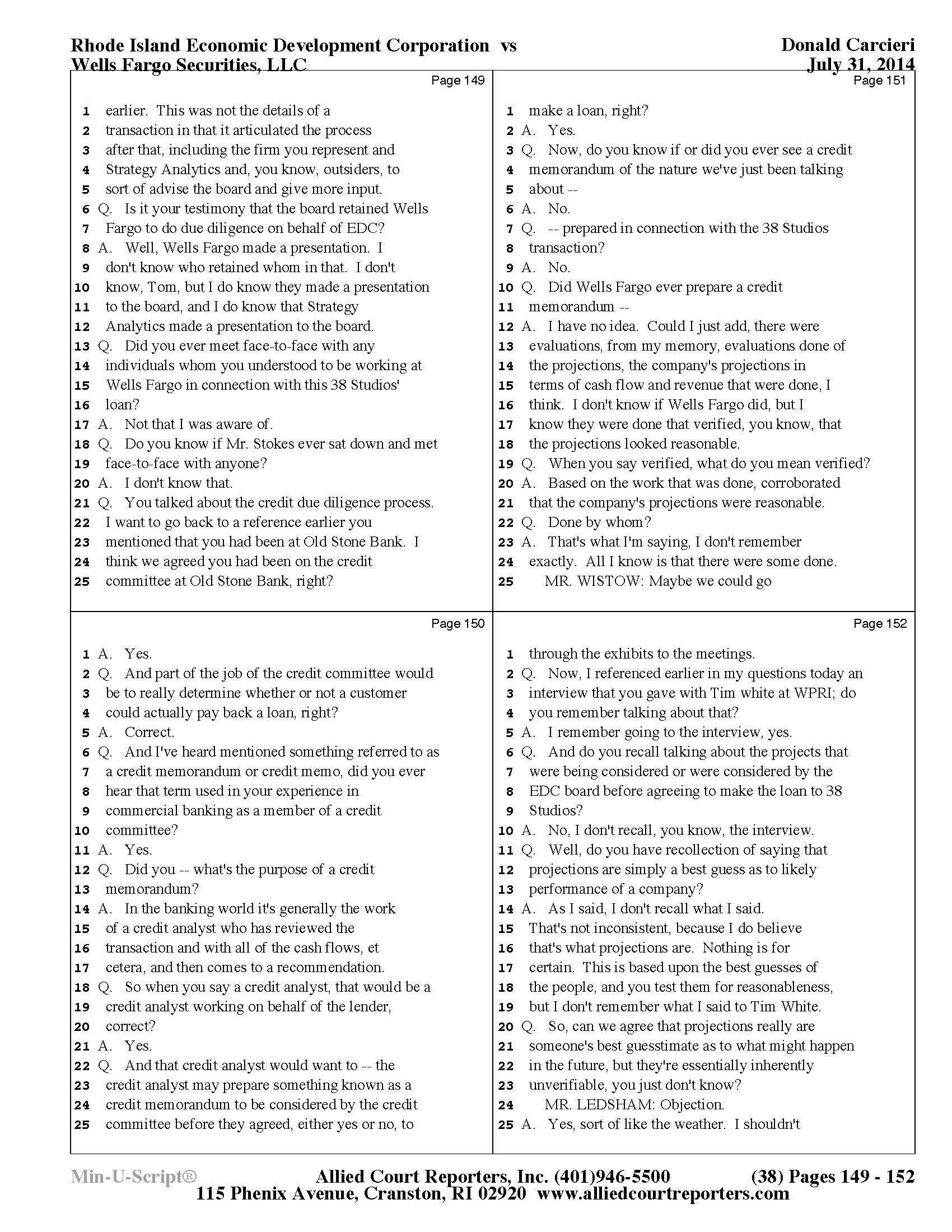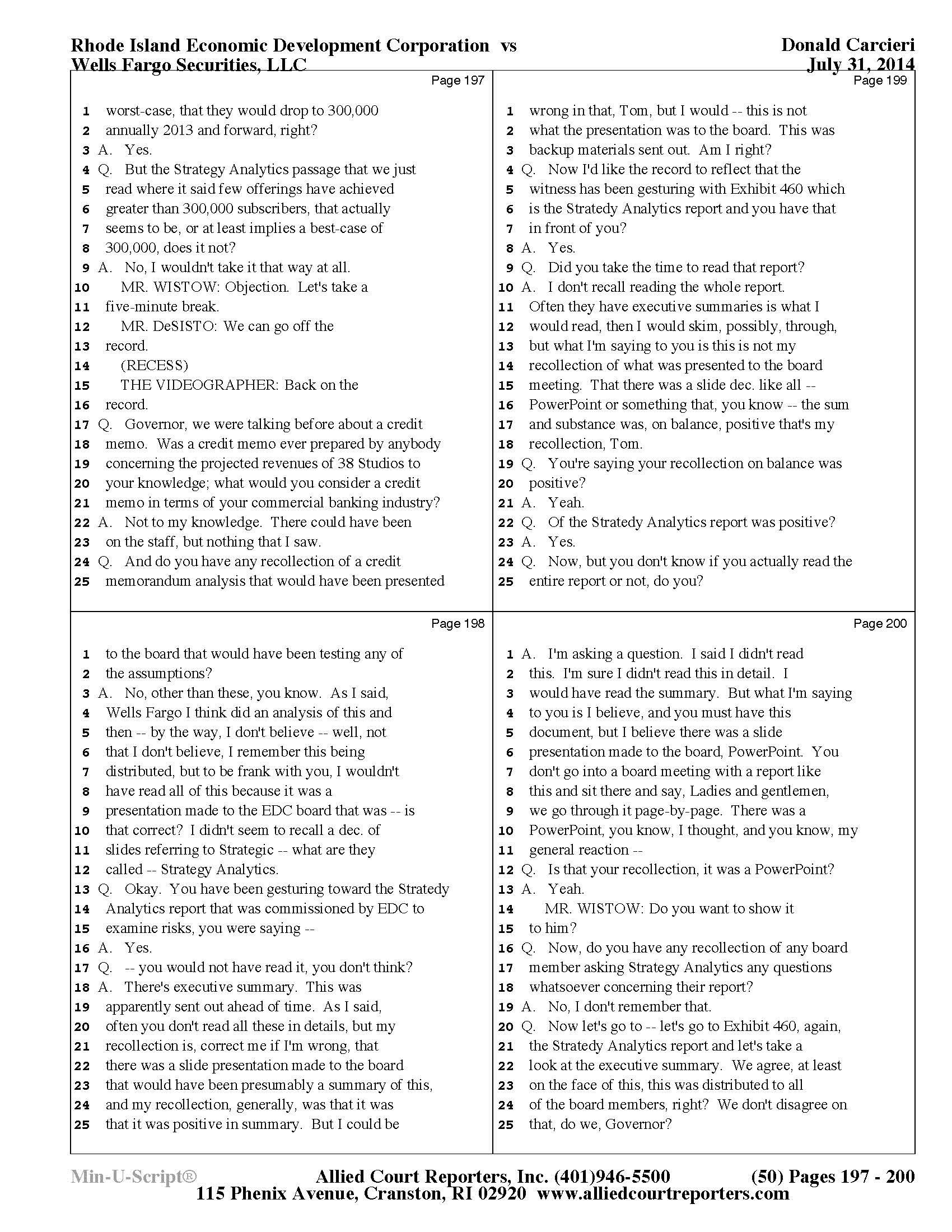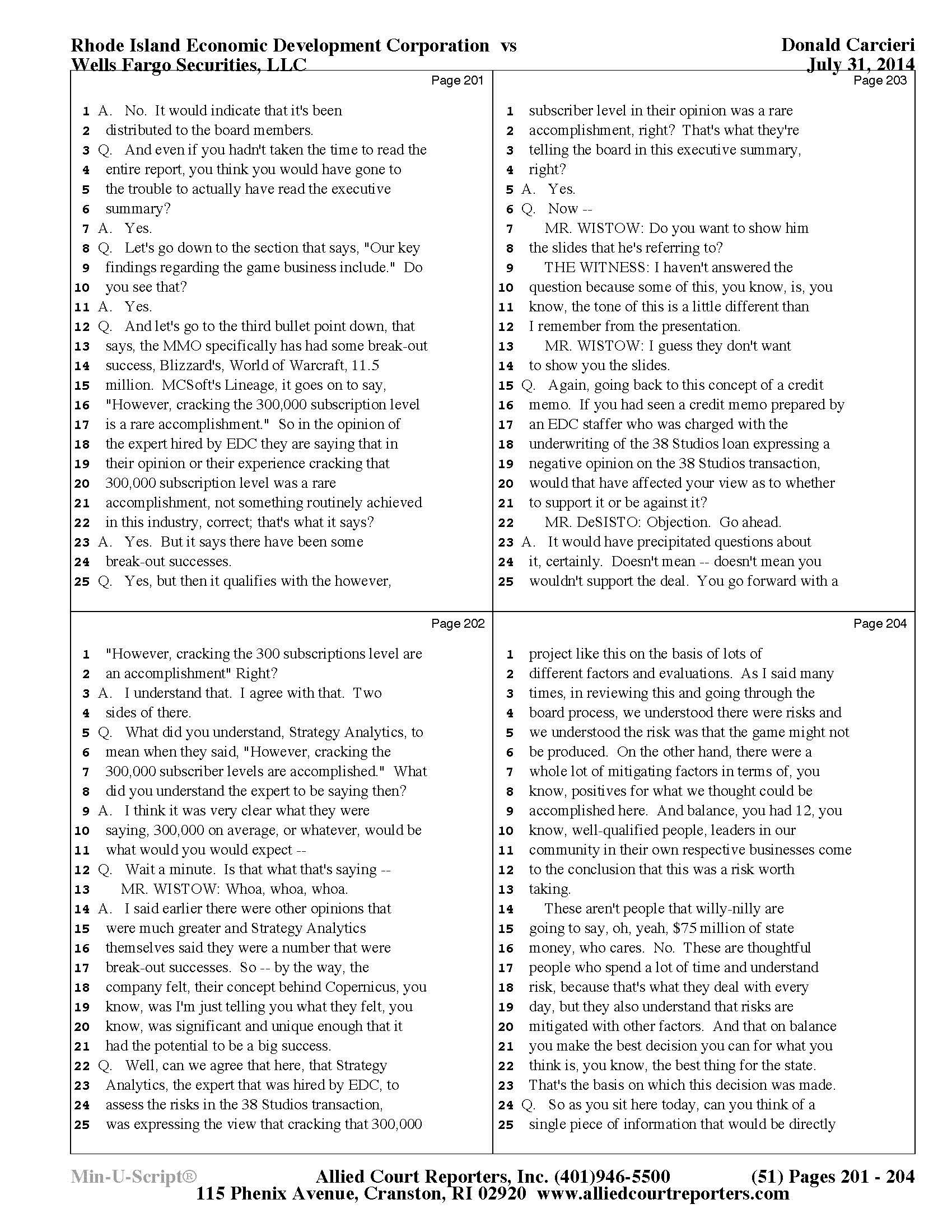 In the course of the deposition Carcieri is asked by Attorney Holt representing Wells Fargo, “38 Studios conservatively estimated gross revenues on the first phase of the game at approximately $450 million through 2015, [how] do you see that?”