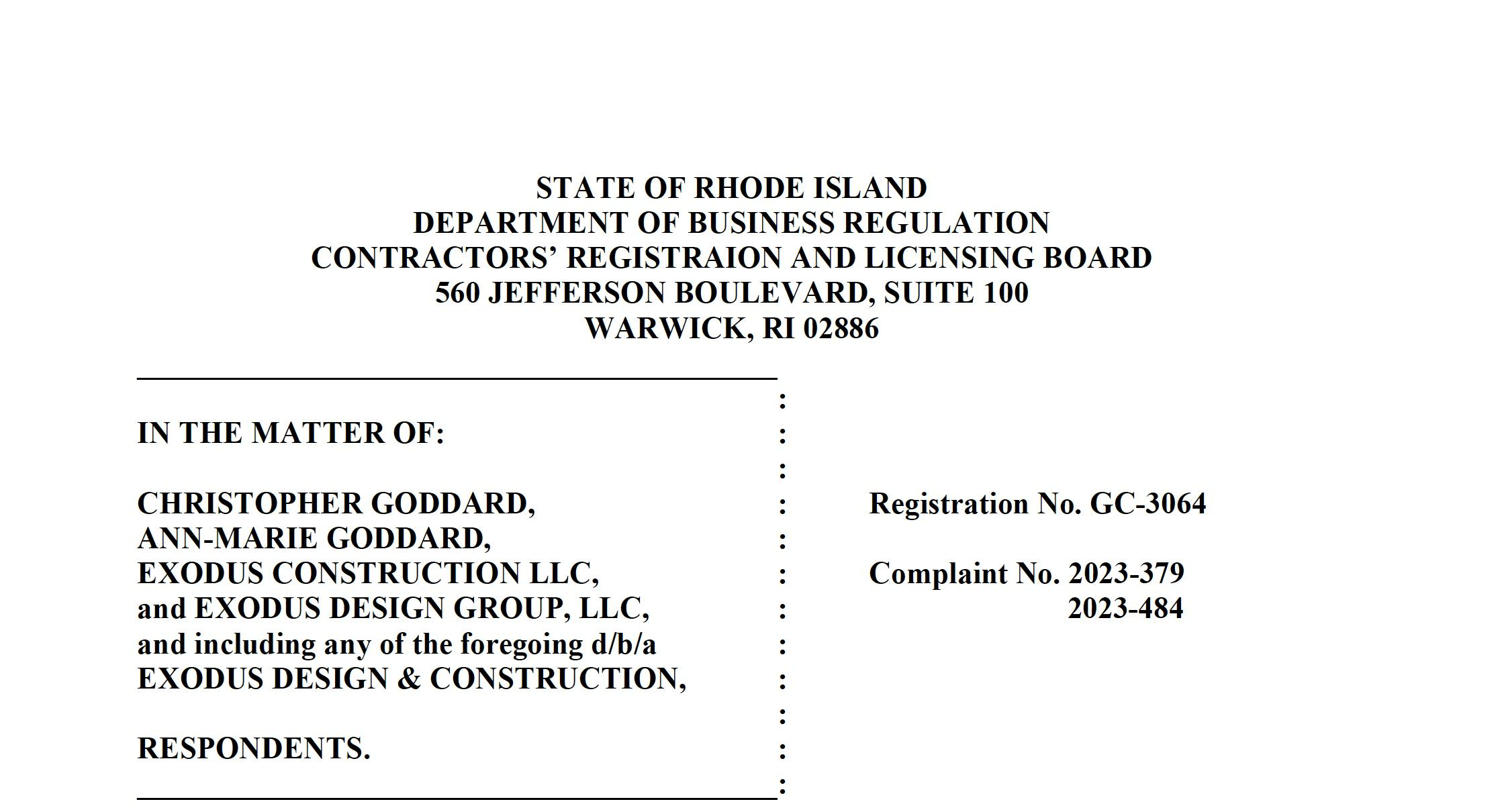 In another case, Matthew and Kara Robenhymer, owners of property in South Kingstown, Rhode Island, filed a complaint in August against Exodus Construction, LLC, Exodus Design Group LLC, Ann-Marie Goddard, and Christopher Goddard, "asserting numerous claims, including breach of contract, negligence, conversion of funds, and unjust enrichment with respect to a residential construction project at their property." The Robenhymers say they were taken for hundreds of thousands of dollars.