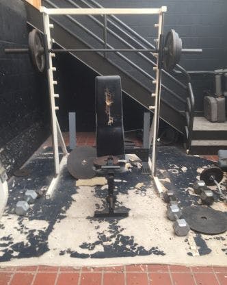 Torn and worn down workout equipment is shown in this picture. Old and rusty weights are all over the gym with no organization.