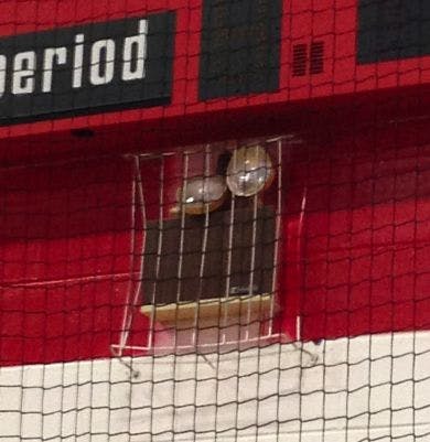 The lights underneath the scoreboard in the basketball gym appear to have been hit a few times to the point where one of the lights is barely attached.