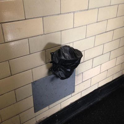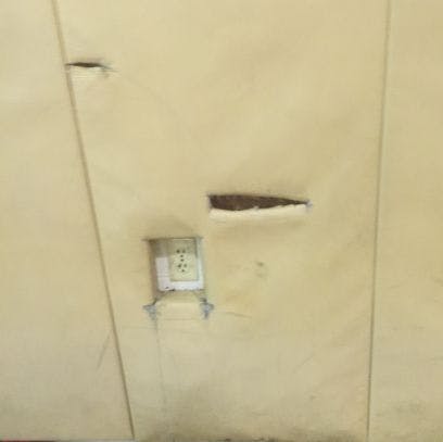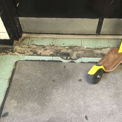 To add on to the missing sign, one of the entrances consists of a broken floor and stained carpet.