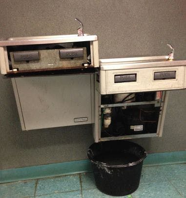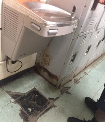 A tile is missing underneath the water fountain at the West End Recreation Center.