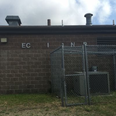 Walking along the side of the recreation center there was a large tear in the fence. This tear was big enough for a person to walk through without any problem.