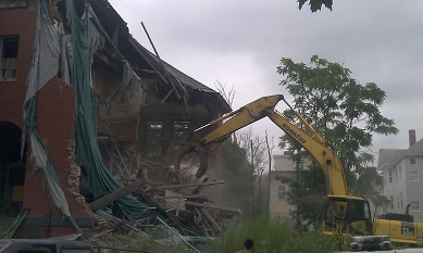 Gilbert Stuart Middle School, located off Elmwood Avenue between the Knight Memorial Library and the West End Community Center, has exit doors surrounded by scaffolding to prevent bricks from falling onto the heads of children as they leave the building. The scaffolded exits have been in existence for several years now.