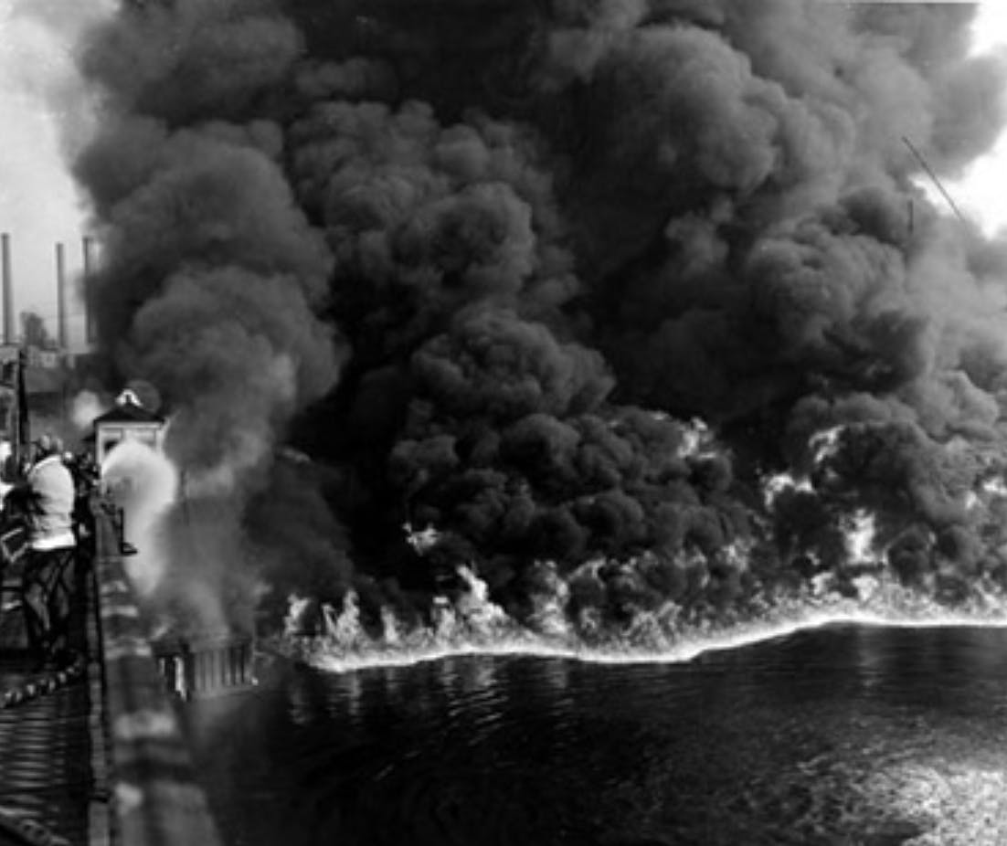Cuyahoga River Fire PHOTO: Cleveland Press Collection at Cleveland State University LibraryFifty years ago, in the summer of 1969, the eyes of the nation turned to Cleveland, Ohio, as the Cuyahoga River, long choked with industrial pollution, burned. Early on a Sunday morning, a spark flared from the train tracks down to the river below, igniting industrial debris floating on the surface of the water. The river had burned before, but the 1969 blaze, contemporaneous as it was with a growing environmental advocacy in the country, made the pages of Time magazine, which described a river “that oozes rather than flows.”