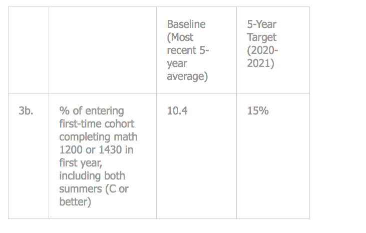 Among the new options are course pairings Math 1420/Math 1430 and Math 0600/Math 1200. Each course listed is a 15 week course. Under the new course offerings for Spring 2017, each 15-week course will be condensed into 7.5 weeks. These pairs directly address metric 3b. The other options, Math 0500/Math 0600 and Math 0500/Math 1420, position students to complete Math 1200 or Math 1430 in the second semester of their first year.