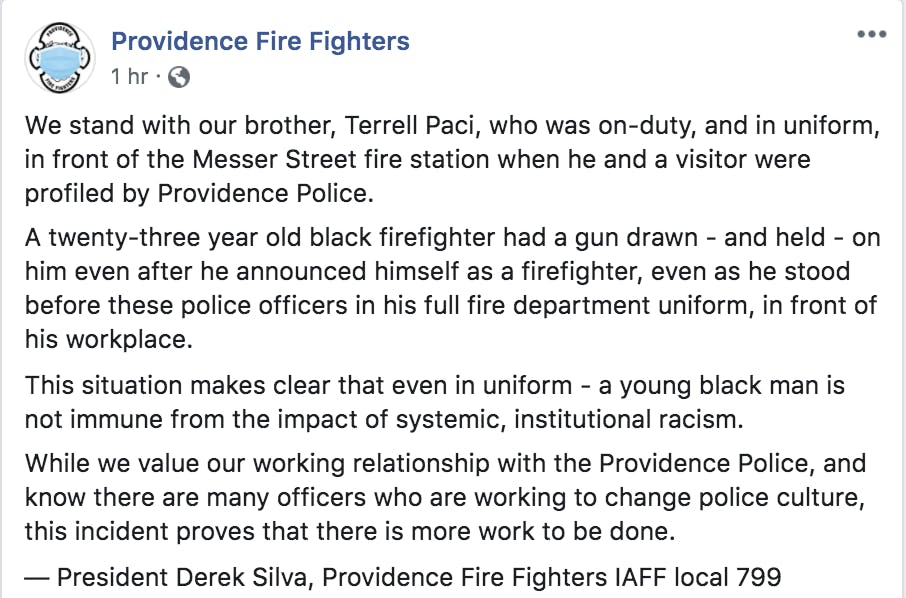 "We stand with our brother, Terrell Paci, who was on-duty, and in uniform, in front of the Messer Street fire station when he and a visitor were profiled by Providence Police.