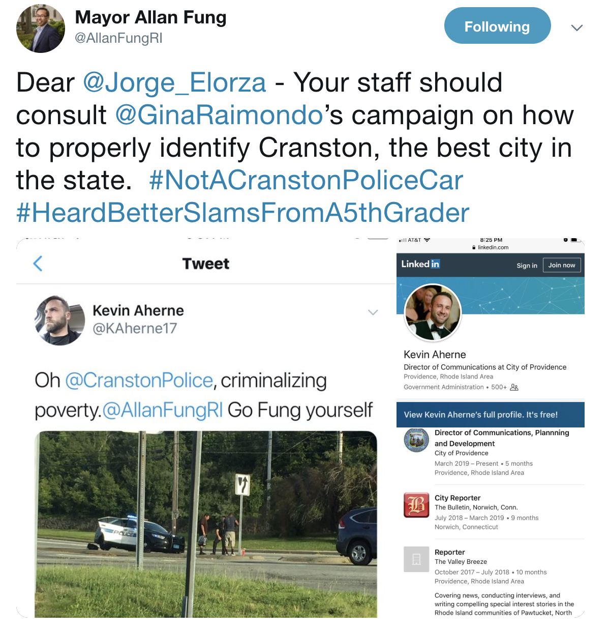 On Tuesday, now-former communications staffer for the city’s planning department Kevin Aherne took a picture of a police cruiser and individuals at an intersection, writing, “Oh Cranston police, criminalizing poverty. @AllanFungRI, Go Fung yourself.”