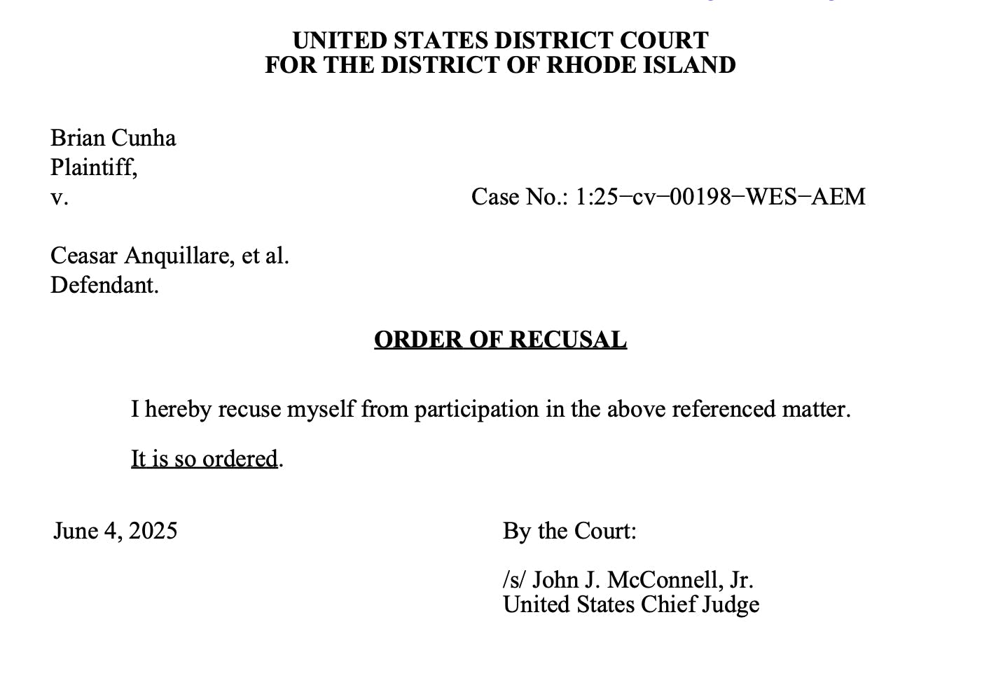 On Wednesday, U.S. District Court Judge John "Jack" McConnell filed notice to the court that he was recusing himself from the case.