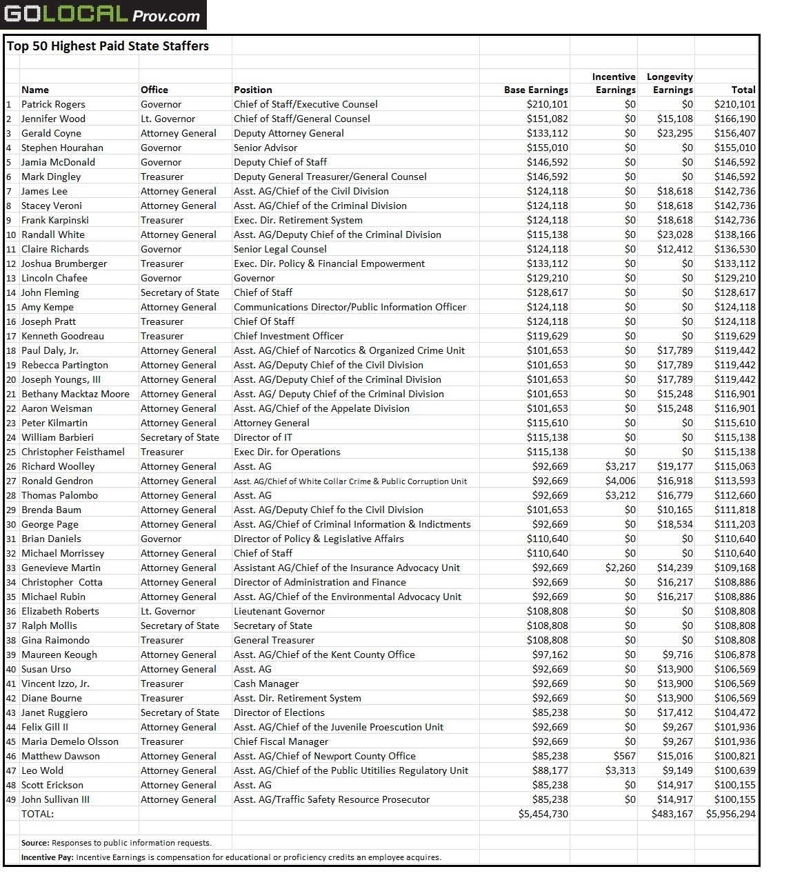 A spokeswoman for the Attorney General said the office has more six-figure earners because of their time worked in the office, professional qualifications, and experience. “The staff of the Office includes seasoned veteran criminal and civil attorneys who have dedicated their professional careers to protect and serve the people of the State of Rhode Island,” said spokeswoman Amy Kempe. “These individuals are at the top of the profession.”