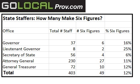 When health and retirement benefits are included, at least 131 employees cost six figures or more, out of a total of 403 employees for the offices of the Governor, Lieutenant Governor, Secretary of State, Attorney General, and General Treasurer. Those at the top include the chief of staffs for the Governor and Lieutenant Governor, both of whom do double duty as the legal counsel for their offices, and, as a result, earn far more than their bosses. (See below chart for the complete breakdown.)