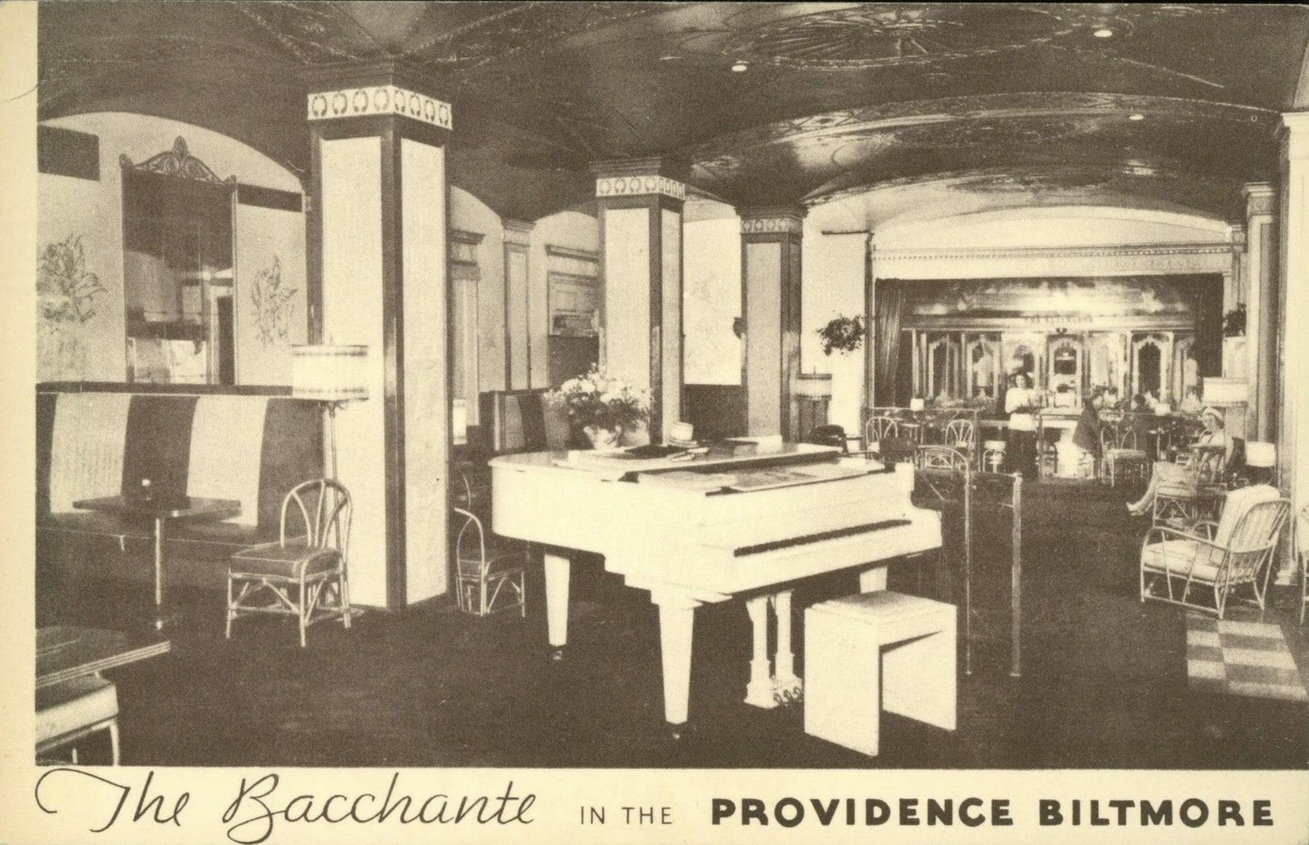 Biltmore’s famous Bacchante Girls were known throughout the country for their beauty and poise, these were the waitresses in the Biltmore’s hip Bacchante Room. The dining area was very intimate, with dimmed lights and mirrored walls. Seating sections were called “banquettes,” which were designed to hold between two and eight people. When one wanted to be served, one pushed a button to summon a Bacchante Girl. She would appear in her costume, which featured a diaphanous, see-through skirt. The bar area had a glass floor which was under lit with pink lighting, a feature which showcased the girls’ beautiful legs.