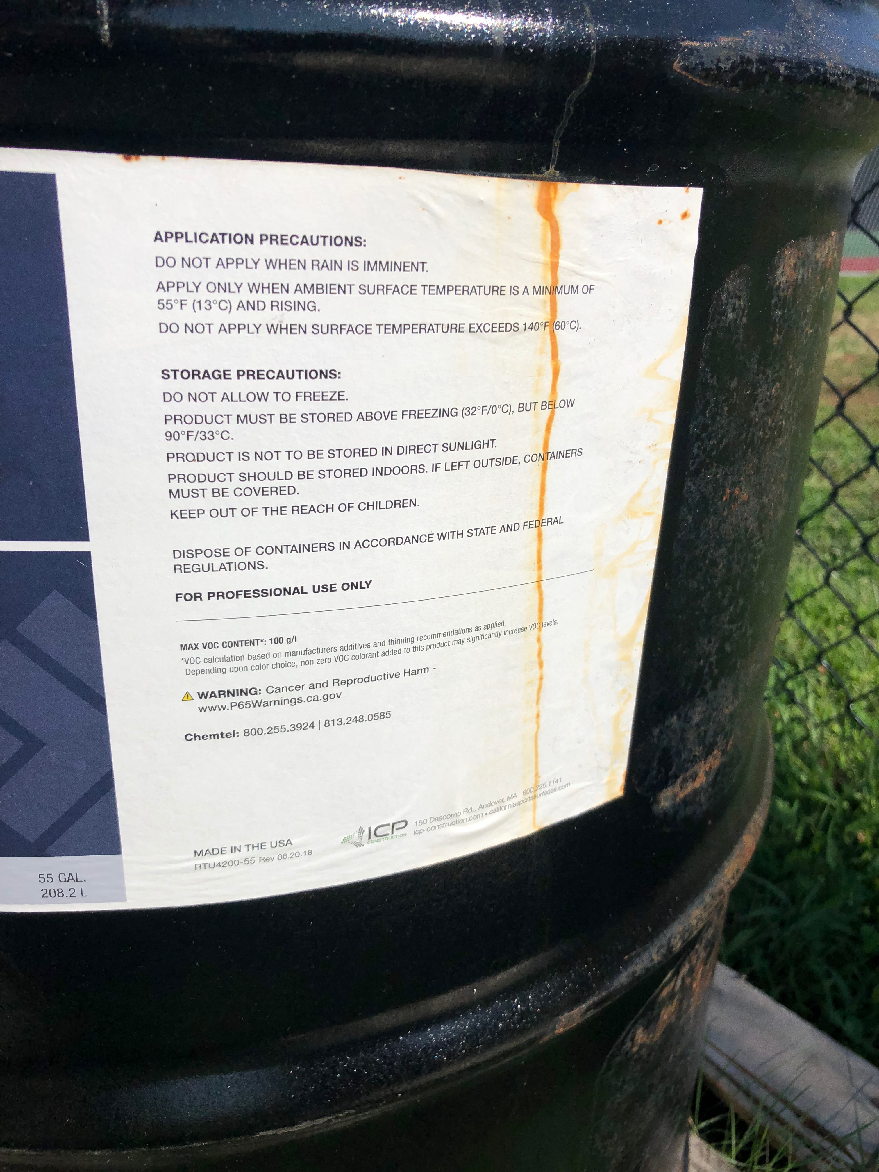 In the bushes are dozens of other containers. Most of the barrels and containers are marked with warning labels that the materials are “cancer causing” or “product not to be stored in direct sunlight.”